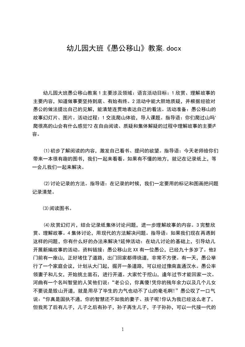 (4)欣赏幻灯片,结合记录纸集体讨论问题,进一步理解故事的内容。3完整欣赏、理解故事。4集体讨论,用现代的方法解决问题。指导语:如果我们现在再遇到这样的问题,你有什么好的办法来解决?延伸活动:在幼儿讨论的基础上,引导幼儿开展新编故事的活动。资料链接:愚公移山北XX有一位愚公,已经九十多岁了。他家门前有一座山,正好堵住了道路,出门回家都得绕道,非常不方便。有一天,愚公举行了一个家庭会议,计划从大门起,掘开一条道路,可以经过豫南直通汉水。愚公率领妻子和儿女,开始挑土凿石,进行开道。大家忙于挖山,逢年过节才能回家一次。河曲有一个名叫智叟的人笑他们说:“老公公,你真傻!凭你的残年余力以及几个儿女,不要说是毁山开道,就是用尽了毕生的力气也动不了山的毫毛啊!”愚公叹了一口气说:“你真是固执不通,你的智慧还不如我的妻子、孩子呢!你认为我已经这么老了,但我死了后有儿子,儿子之后有孙子,孙子再生儿子,子子孙孙,可以一代接一代的开凿,而山是死的,不会再增加,何必担心大山不能被我们一家铲平呢?”上帝知道了愚公这样的坚毅精神,非常感动,于是将两座大山从他的门前移开,一座放在朔东,一座放在雍南。幼儿园大班愚公移山教案2活动目标:1、欣赏、理解故事的主要内容,知道做事要坚持到底、有始有终。