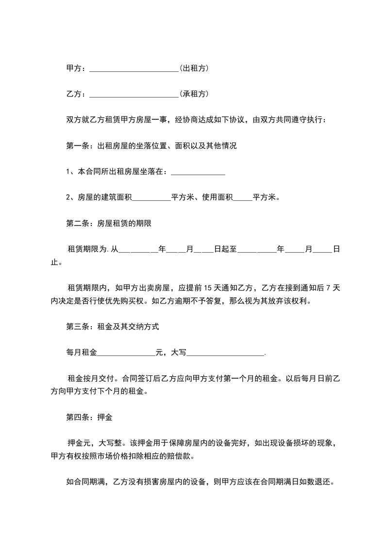 二、房屋租期为________年,从___________年_______月____日至___________年_______月____日。乙方租赁房屋作为居住使用。租赁期满,甲方有权利收回出租的房屋,乙方应如期归还。乙方要求续租,则必须在租赁期满日一个月前通知甲方,经甲方同意后,乙方在交清全年租金的同时,重新签订租赁合同。如果乙方不再租房,须提前_____个月告知甲方。
