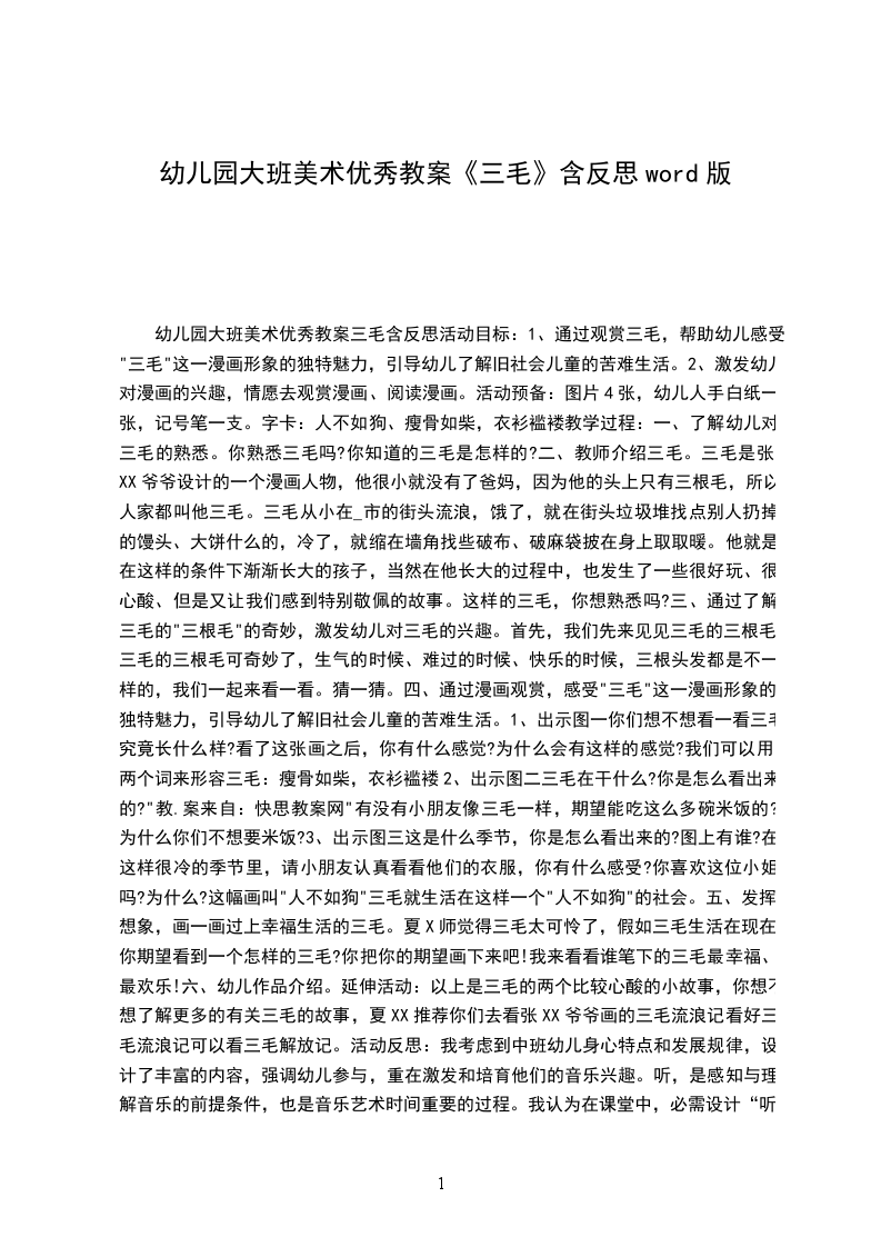 六、幼儿作品介绍。延伸活动:以上是三毛的两个比较心酸的小故事,你想不想了解更多的有关三毛的故事,夏XX推荐你们去看张XX爷爷画的三毛流浪记看好三毛流浪记可以看三毛解放记。活动反思:我考虑到中班幼儿身心特点和发展规律,设计了丰富的内容,强调幼儿参与,重在激发和培育他们的音乐兴趣。听,是感知与理解音乐的前提条件,也是音乐艺术时间重要的过程。我认为在课堂中,必需设计“听”的环节,分层次、有目的的让幼儿听,让幼儿充分地感受音乐的美,能有效地反映幼儿的学习兴趣,引发幼儿对音乐的想像和联想。还可以培育良好的音乐习惯,使幼儿逐步积累起感受和鉴赏音乐的经验。我还想通过音乐的“弥散性”让孩子们学会歌曲,因此,我让他们听“歌词”,学习“英语单词”,“理解歌词内容,听“心情”,边听边创编动作。但是有些失败,因为他们虽然许多都听过十个小印第安人,但歌词记得并不熟,而且究竟只是幼儿园的小孩子,他们所能做到的也仅限于对唱曲的初步观赏,创编一些简洁的动作而已。缺少老师的引导他们很难再有更深一步的进度。因此我觉得在我的思维目标中给他们的定位过高了一点。在今后的教学当中我还应当更多的考虑一下孩子们的实际水平和把握程度,应先让孩子们在特别熟识歌曲后再对他们进行下一步的要求才行。在教学中,只有不断地反思、总结、修改,才会不断地进步。