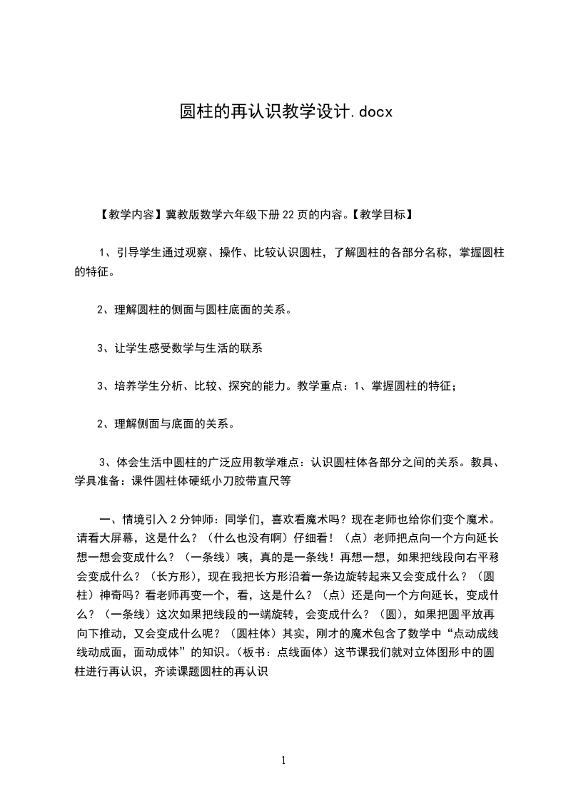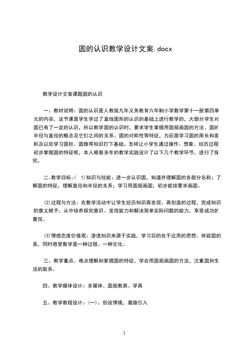 (五)、课外延伸,拓展提高请同学们课后在操场上画一个半径10米的圆,想想办法,怎么画?板书设计:圆的认识圆心O能决定圆的位置(定点)半径能决定圆的大小(定长)直径d同圆(等圆)半径、直径:无数条且长度相等教学设计文案课题圆的认识教学反思:我执教的“圆的认识”是义务教育六年制小学数学课本第十一册的内容。它是在低年级初步认识圆的基础上进行教学的。此前虽然已经初步认识过圆,但对于建立正确的圆的概念以及掌握圆的特征还是比较困难的。由认识平面的直线图形到认识平面上的曲线图形,是认识发展的又一次飞跃。我觉得成功的地方有以下几点:1、导入比较好,我借助多媒体中小动物开不同车轮胎引入,让学生讨论谁开的车快,学生根据已有经验很快就说出答案,但为什么,学生不知道,这节课我们就来研究圆,找答案,激发了学生学习的兴趣。