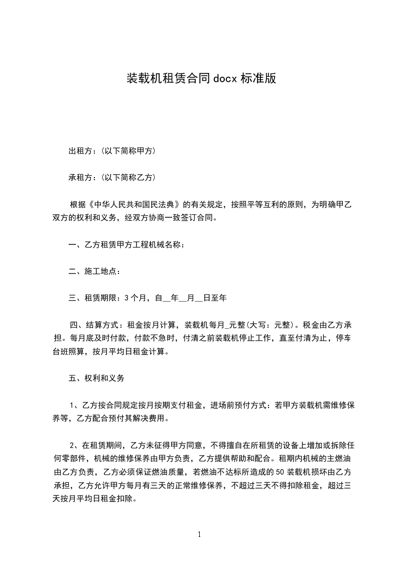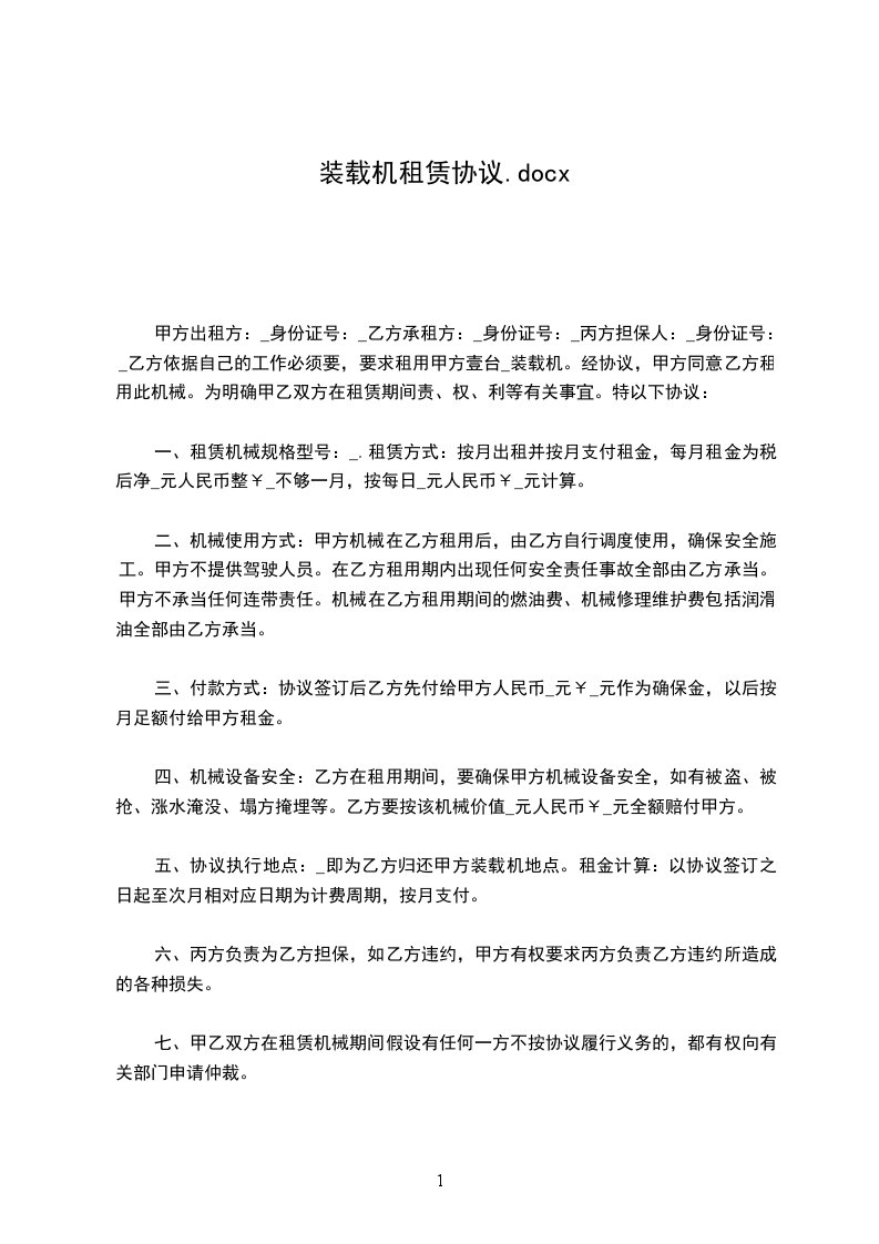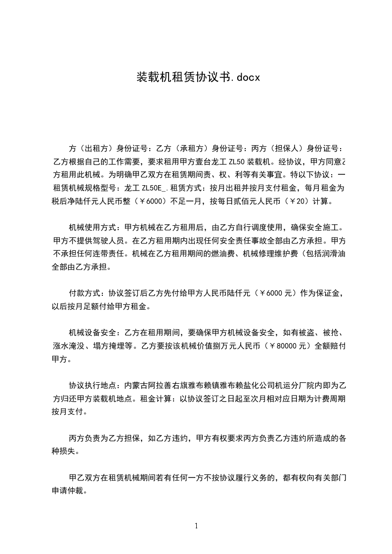 方(出租方)身份证号:乙方(承租方)身份证号:丙方(担保人)身份证号:乙方根据自己的工作需要,要求租用甲方壹台龙工ZL50装载机。经协议,甲方同意乙方租用此机械。为明确甲乙双方在租赁期间责、权、利等有关事宜。特以下协议:一、租赁机械规格型号:龙工ZL50E_.租赁方式:按月出租并按月支付租金,每月租金为税后净陆仟元人民币整(¥6000)不足一月,按每日贰佰元人民币(¥20)计算。