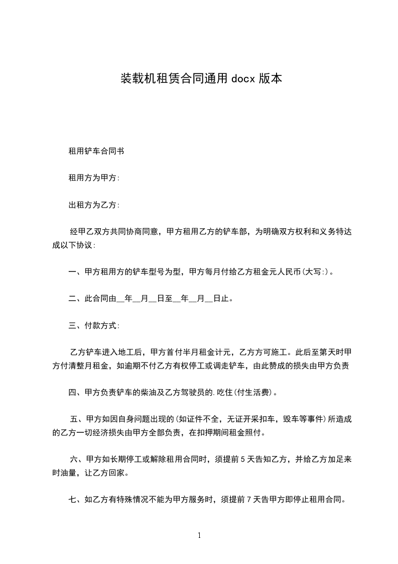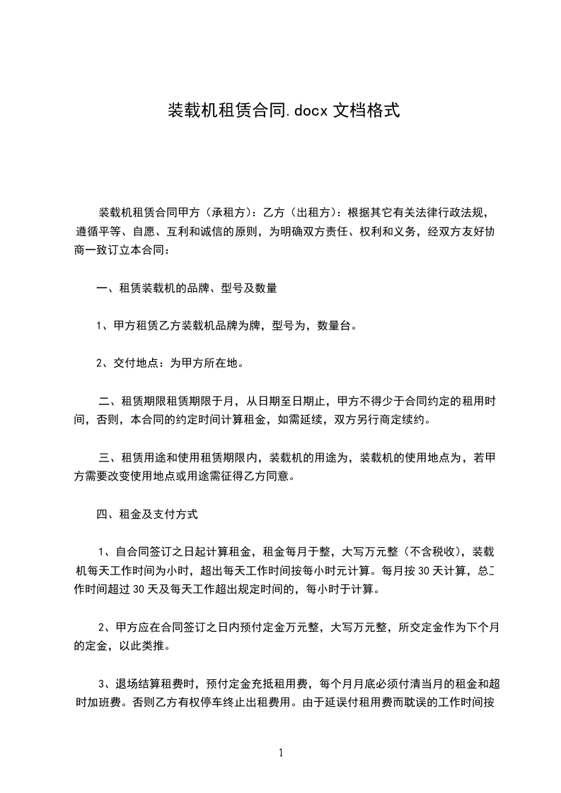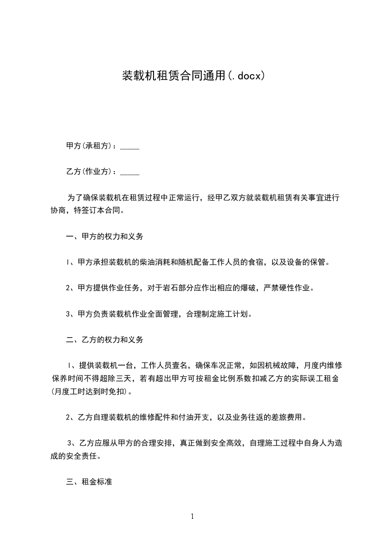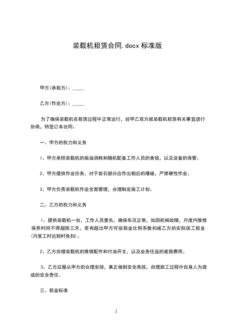 方(出租方)身份证号:乙方(承租方)身份证号:丙方(担保人)身份证号:乙方根据自己的工作需要,要求租用甲方壹台龙工ZL50装载机。经协议,甲方同意乙方租用此机械。为明确甲乙双方在租赁期间责、权、利等有关事宜。特以下协议:一、租赁机械规格型号:龙工ZL50E_.租赁方式:按月出租并按月支付租金,每月租金为税后净陆仟元人民币整(¥6000)不足一月,按每日贰佰元人民币(¥20)计算。