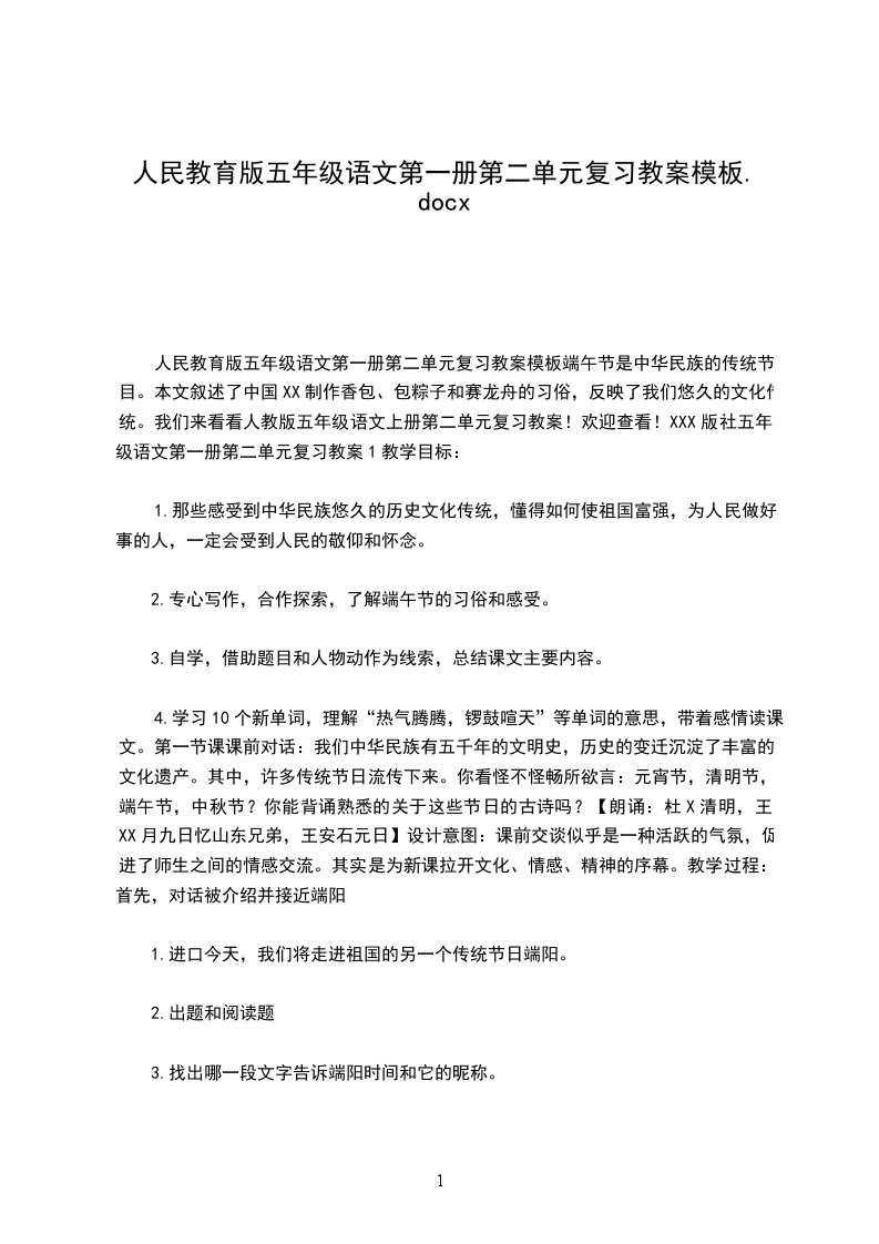 人民教育版五年级语文第一册第二单元复习教案模板端午节是中华民族的传统节目。本文叙述了中国XX制作香包、包粽子和赛龙舟的习俗,反映了我们悠久的文化传统。我们来看看人教版五年级语文上册第二单元复习教案!欢迎查看!XXX版社五年级语文第一册第二单元复习教案1教学目标: