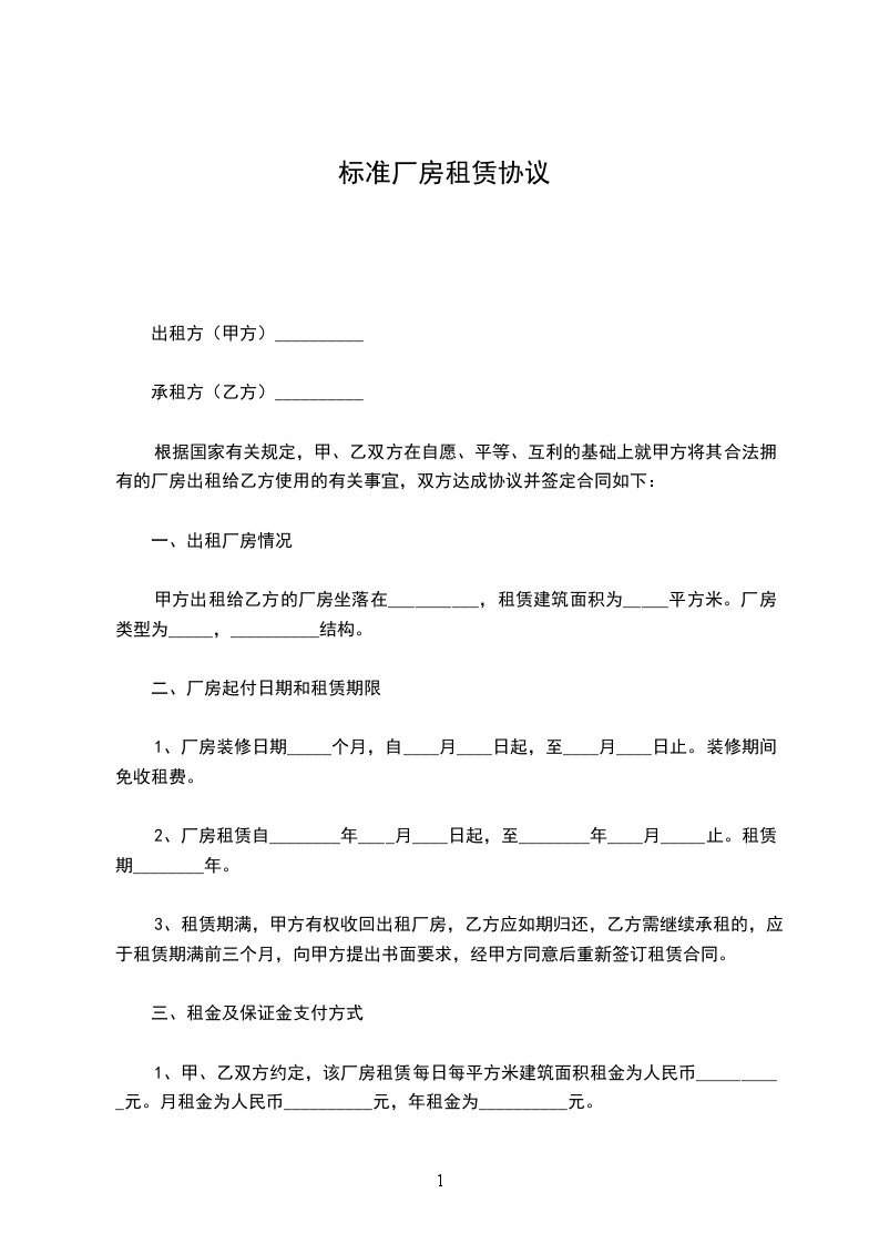 1、甲、乙双方约定,该厂房租赁每日每平方米建筑面积租金为人民币__________元。月租金为人民币__________元,年租金为__________元。