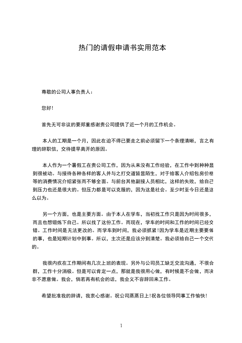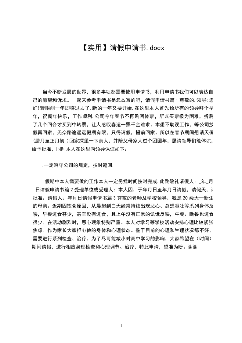 .假期中本人需要做的工作本人一定另找时间按时完成.此致敬礼请假人:_年_月_日请假申请书篇2受理单位或受理人:本人因,于年月日至年月日请假,请假天,请批准。请假人:年月日请假申请书篇3尊敬的老师及学校领导:我是20级大一新生的母亲。近期因饮食原因,从晨起到白天经常持续出现恶心、总想呕吐等系列身体反映,早餐进食甚少,甚至没有进食,且上午没有正常的饥饿反映,午餐、晚餐也进食很少。在活动剧烈时,恶心现象特别严重。本人对学习等学校活动安排心理比较紧张、焦虑。作为家长大家担心他的身体和心理状态。鉴于目前的心理和生理状况都不好,需要进行系列检查、治疗。为了尽可能减小对高中学习的影响,大家希望在(时间)期间请假,进行相应身理检查和心理调节、治疗,特此申请,望准为盼。谢谢!