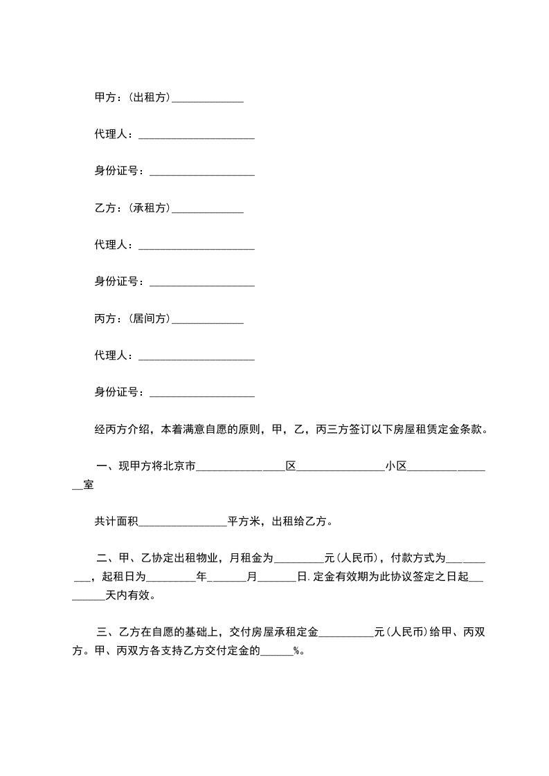 三、乙方在自愿的基础上,交付房屋承租定金__________元(人民币)给甲、丙双方。甲、丙双方各支持乙方交付定金的______%。