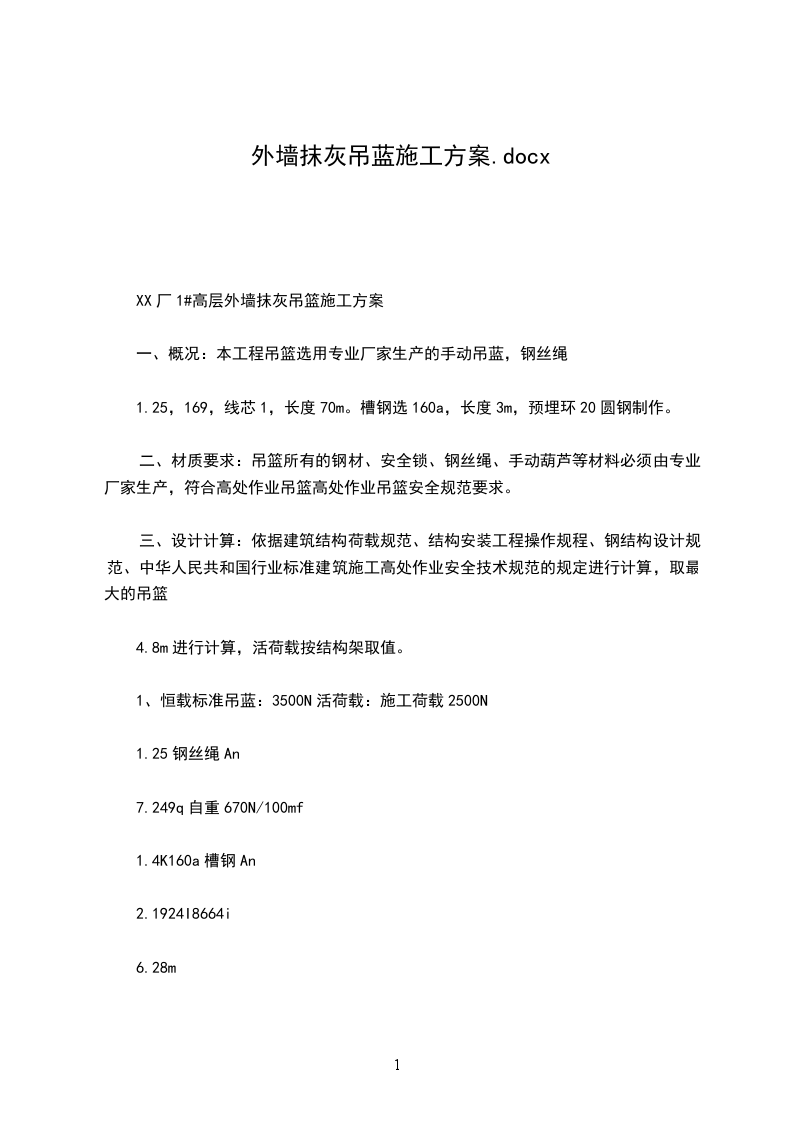 一、概况:本工程外墙抹灰采用悬挂吊篮,吊篮悬挂总高度65m,吊篮规格