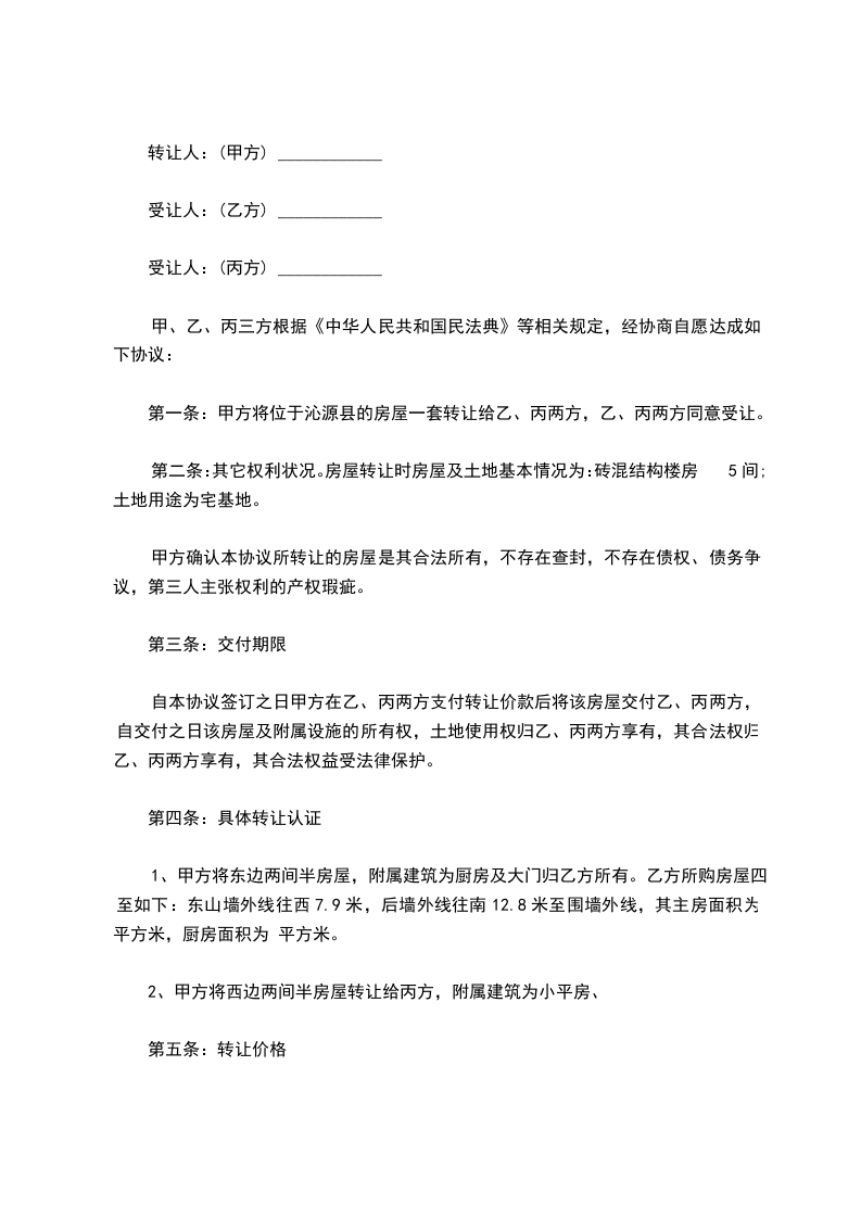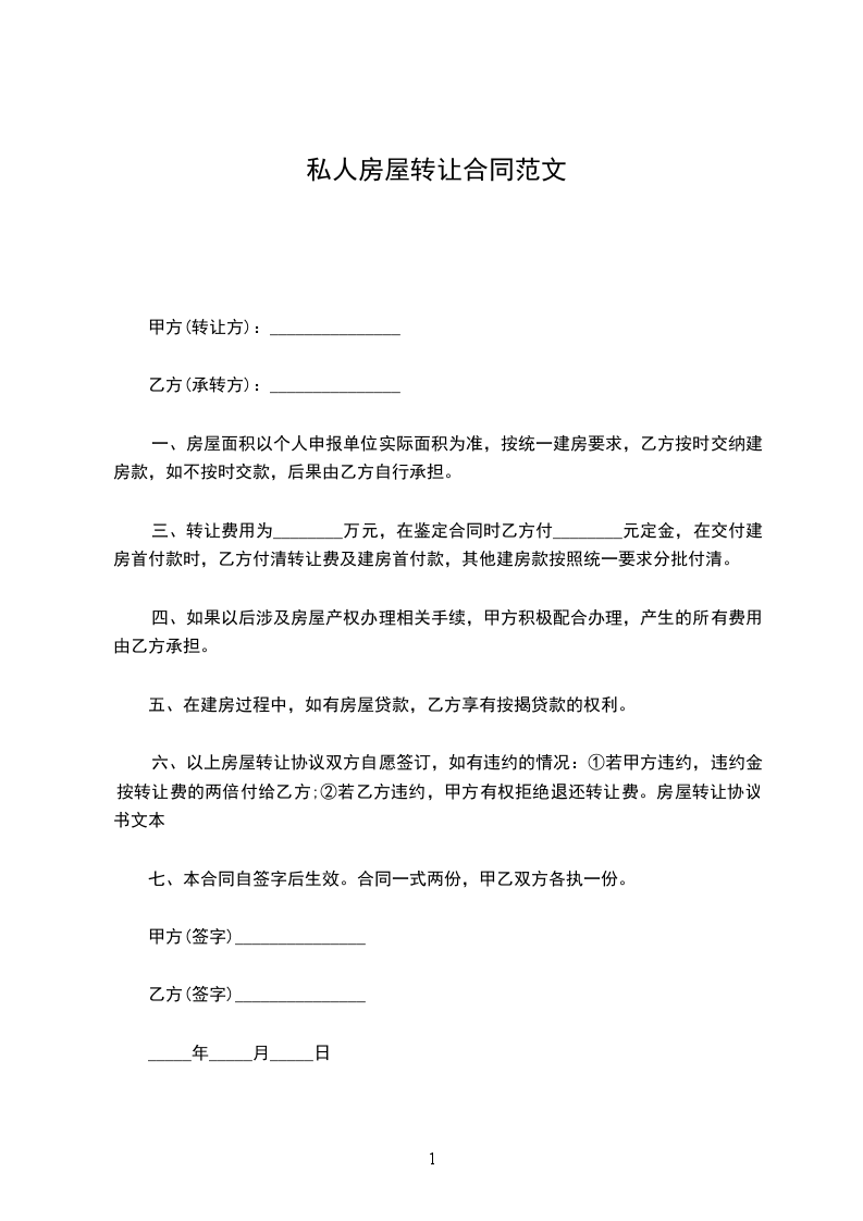 六、以上房屋转让协议双方自愿签订,如有违约的情况:①若甲方违约,违约金按转让费的两倍付给乙方;②若乙方违约,甲方有权拒绝退还转让费。房屋转让协议书文本