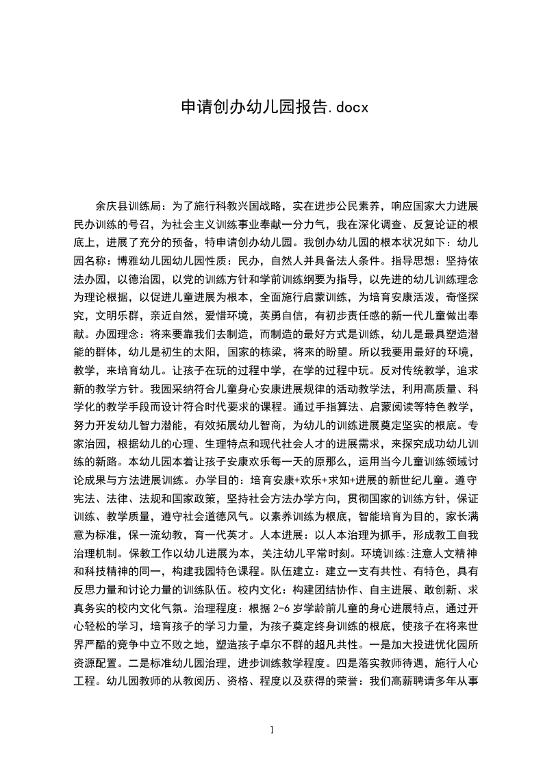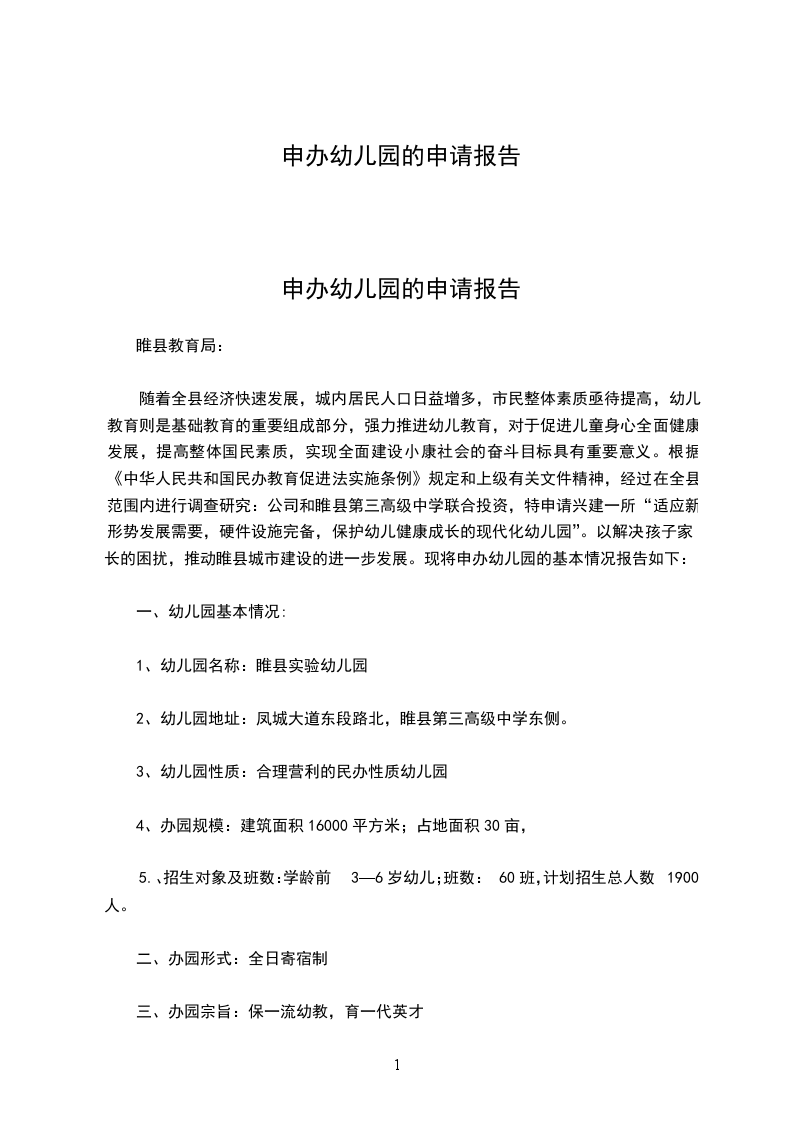 为了实施科教兴国战略,切实进步公民素质,响应国家大力发展民办教育的号召,为社会主义教育事业贡献一分气力,我在深进调查、反复论证的基础上,进行了充分的预备,特申请开办幼儿园。我开办幼儿园的基本情况如下: