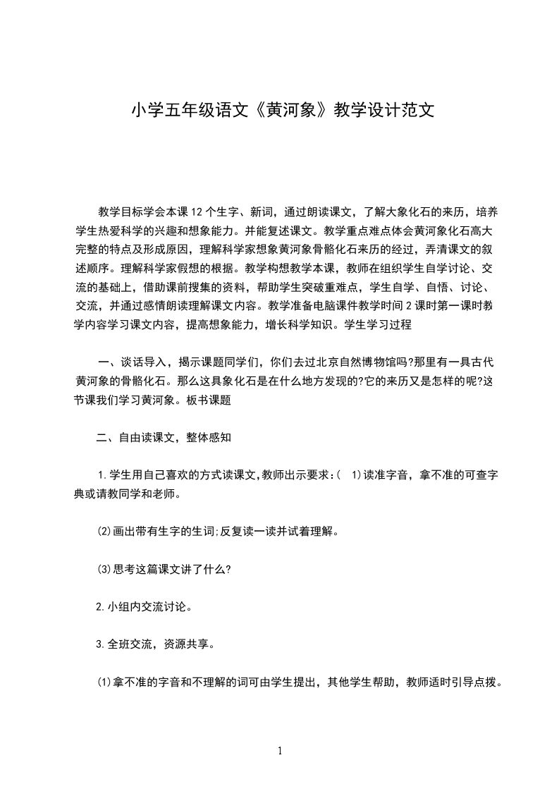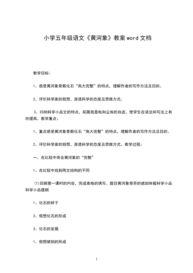 3、提升学生的想象水平。情感态度价值观:培养学生的想象力和学习科学知识的兴趣。教学重点、难点:引导学生结合生活实践,展开想象,从而理解和领会科学家关于黄河象化石形成过程的假想,增长科学知识。教学准备:课件、学生搜集的相关资料。教学课时安排:两课时教学过程:第一课时