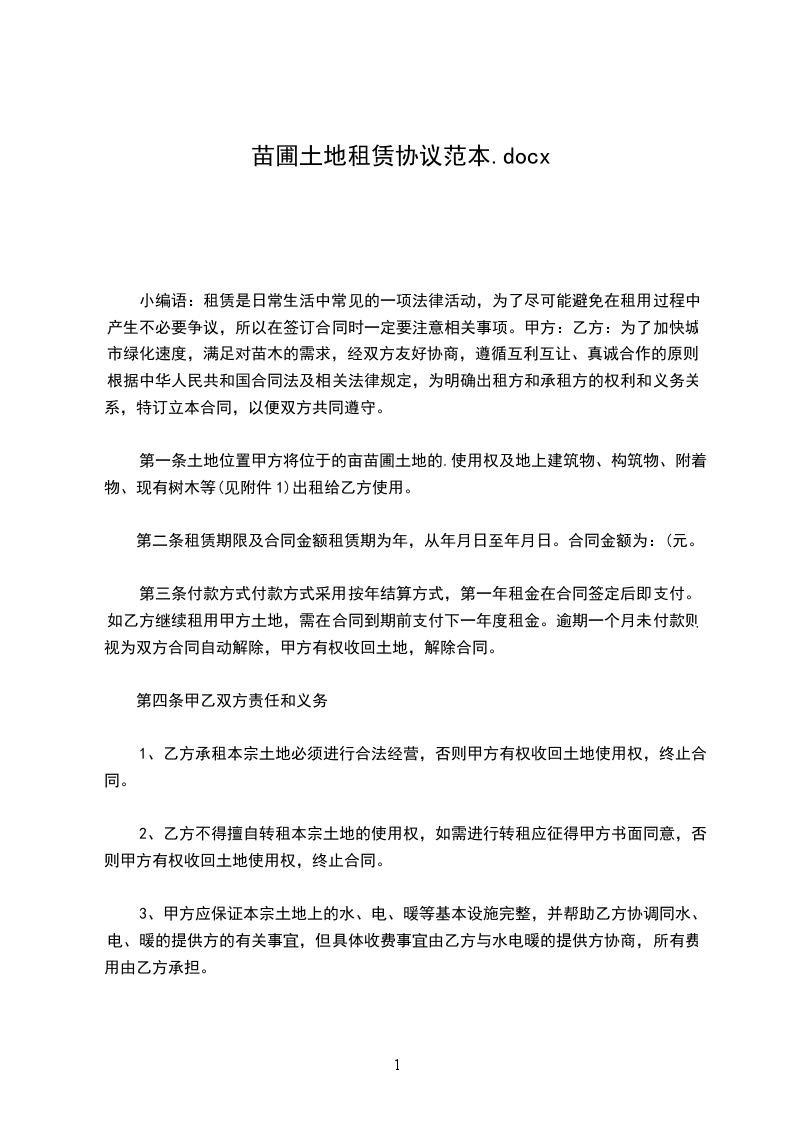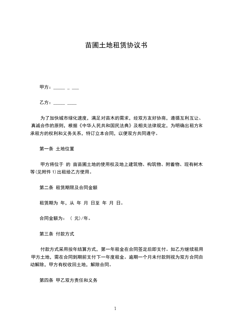 第一条土地位置甲方将位于的亩苗圃土地的.使用权及地上建筑物、构筑物、附着物、现有树木等(见附件1)出租给乙方使用。