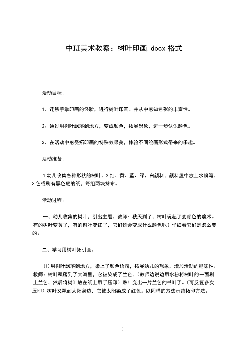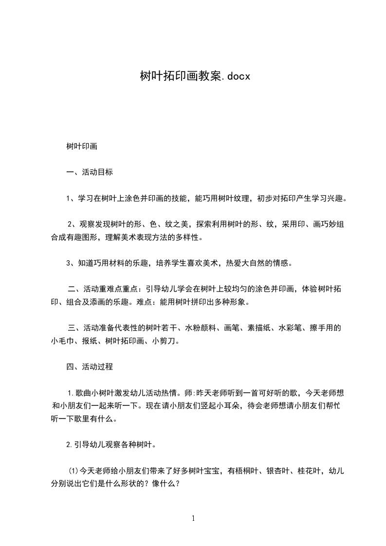 二、活动重难点重点:引导幼儿学会在树叶上较均匀的涂色并印画,体验树叶拓印、组合及添画的乐趣。难点:能用树叶拼印出多种形象。