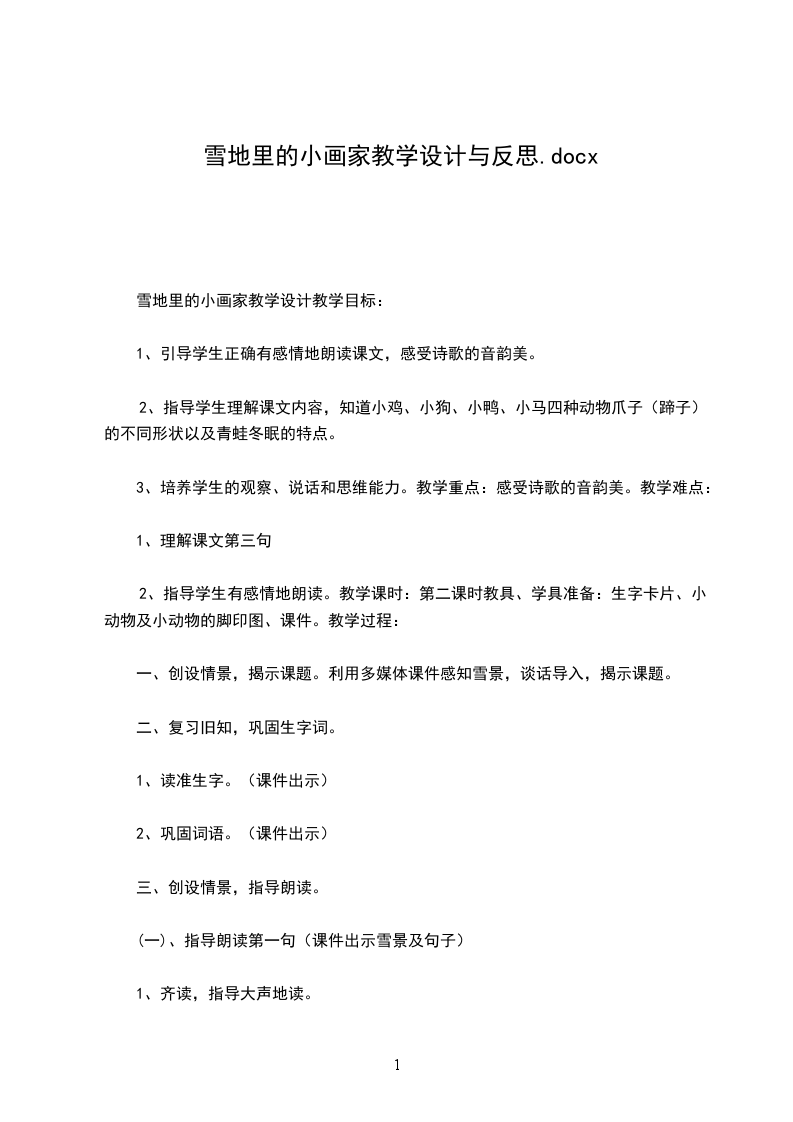三、充分利用多媒体课件,突破重难点。“小鸡画竹叶,小狗花梅花,小鸭画枫叶,小马画月牙。”这句话描写了小画家的快乐、喜悦,但一年级学生没有形成一种对语言的感受能力,朗读课文时只能读出字音,不能感知领悟语言文字中所传递的情意。如何让学生读出,读活词语,让这一个个抽象的词语变成他们的脑海中一张张美丽的图画,一幅生动活泼的画面,在教学中,我充分利用多媒体课件创设情景,来引导感受,让孩子观看动画中四位小画家在雪地上留下的串串脚印,听到它们的叫声,再观看脚印与事物的对比图,马上唤起学生对生活的回忆,产生喜欢之情,然后,进行想象说话“它们在雪地上画画时,会怎么评价自己或别人的画呢”使学生走进了文本,走进了雪地,从而体会到小画家的喜悦之情,让学生真正地去体验出美丽的意境。这时再引导学生读,就水到渠成,读得勃勃生机。这课时设计的内容较多,虽然是按计划完成了教学任务,教学效果还可以,但总觉得教学过程有些匆忙,抓得不够实。而且,在课堂上,自己过于拘束,对孩子及时的肯定、鼓励性评价不够。,原本想带着孩子唱一唱,跳一跳,让孩子既感受到快乐,又巩固了课文的内容,但因为紧张,也就只是让孩子静静地坐着听了,没有达到我预期的效果。欢迎您的,资料仅供套考!致力为企业和个人提供合同协议,策划案计划书,学习资料等等打造全网一站式需求6欢迎
