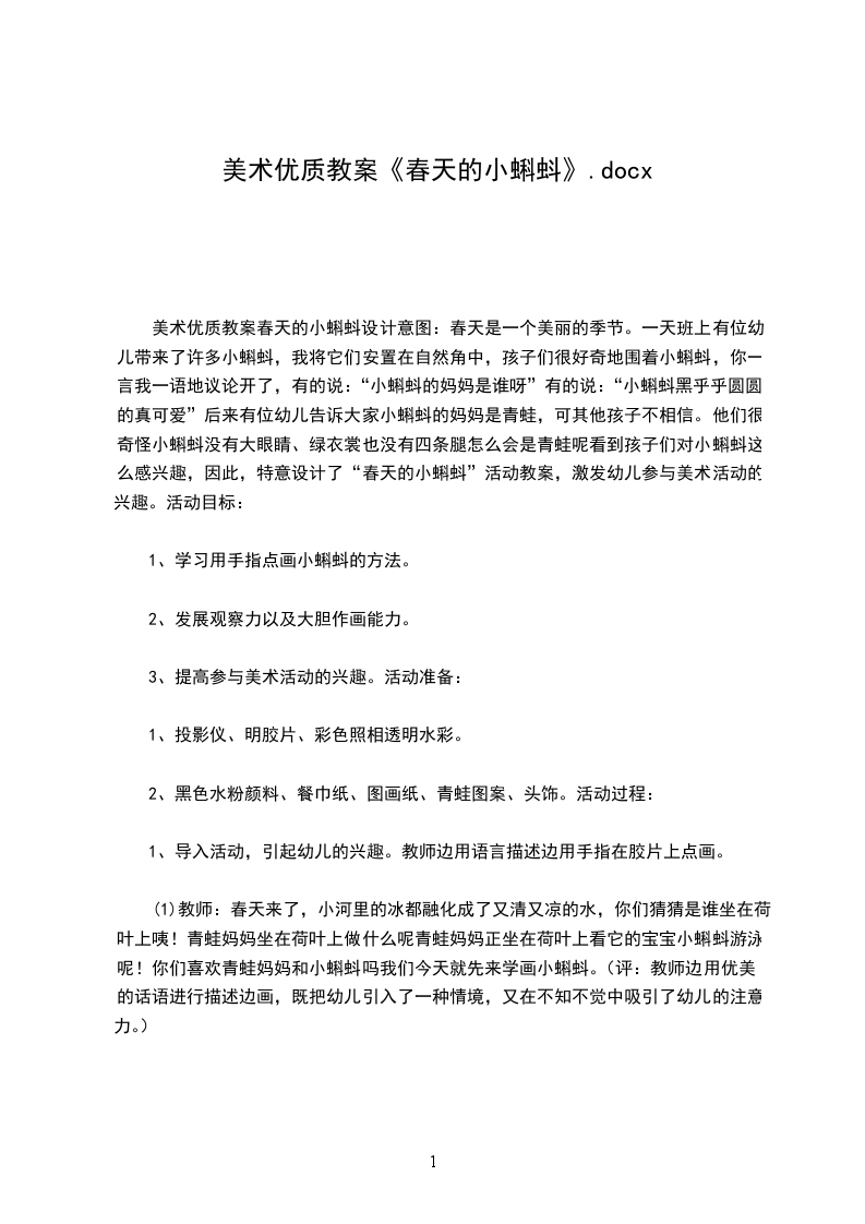 美术优质教案春天的小蝌蚪设计意图:春天是一个美丽的季节。一天班上有位幼儿带来了许多小蝌蚪,我将它们安置在自然角中,孩子们很好奇地围着小蝌蚪,你一言我一语地议论开了,有的说:“小蝌蚪的妈妈是谁呀”有的说:“小蝌蚪黑乎乎圆圆的真可爱”后来有位幼儿告诉大家小蝌蚪的妈妈是青蛙,可其他孩子不相信。他们很奇怪小蝌蚪没有大眼睛、绿衣裳也没有四条腿怎么会是青蛙呢看到孩子们对小蝌蚪这么感兴趣,因此,特意设计了“春天的小蝌蚪”活动教案,激发幼儿参与美术活动的兴趣。活动目标: