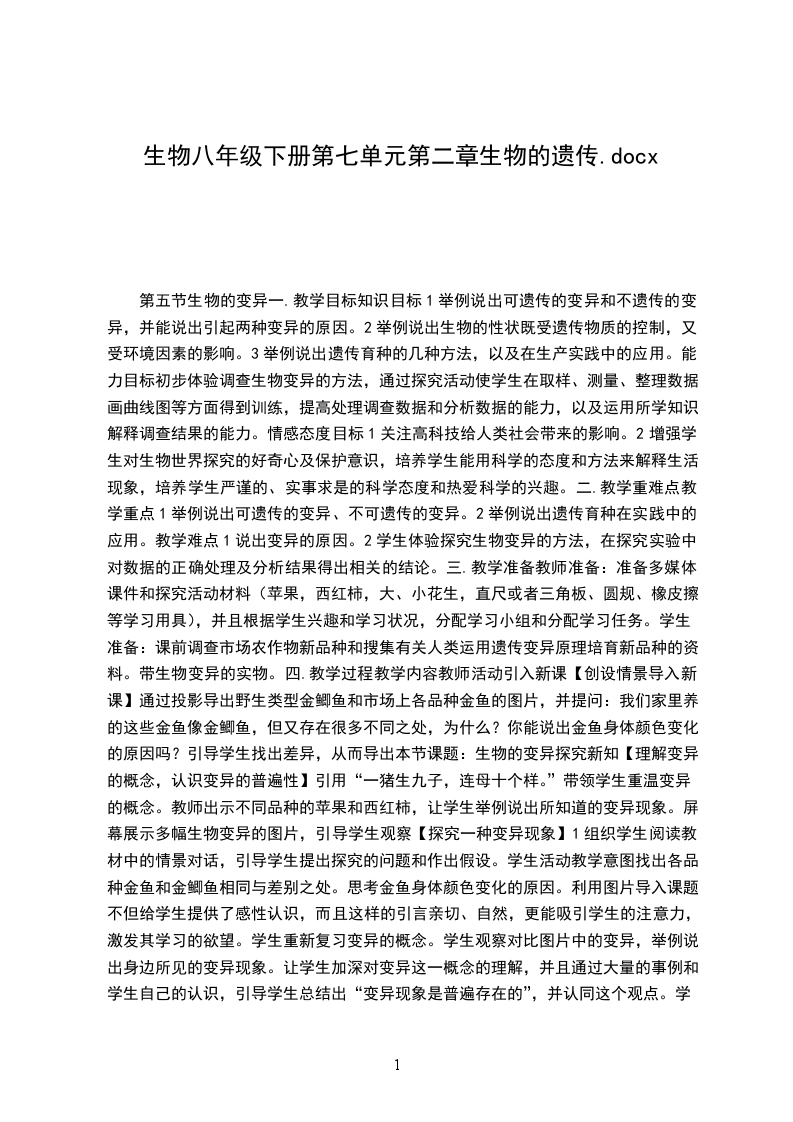 (6)为了更直观的说明问题,我们还可以怎么做?长度值,也说明这是两个别人的成果,培品种,但是大、小两种花养了学生的批生的两条曲线有交叉,说判、反思思维。明大花生品种中也有较教师最后的点小的花生,小花生品种中评,补充了学生也有较大的花生,这种差的评价,使整个异可能是环境因素引起汇报活动更加完的,属于不可遗传的变整,体现教师的异。”其他小组聆听后,指导作用。可以提出自己的拓展和补充。学生举出生活中的可遗传变异和不可遗传变异的例子。3发给每个小组探究实验报告表一份和坐标纸。讲清楚实验中的注意事项及测量花生的方法等,提醒学生记录数据。根据各小组实验情况,给予及时指导和评价。【引出变异原因,归纳出变异类型】选取优秀的小组的实验报告通过实物投影仪进行展示。教师引导学生对实验结果进行分析,并对学生的分析进行总结:“大、小两种花生的差异是品种不同造成的,属于可遗传变异,而同一品种的内部差异是由于环境等原因的影响,未改变遗传物质,属于不可遗传变异。”引导学生注意书本的“小资料”,遗传物质的改变是哪些东西发生了变化。同时教师也要提醒学生:“由于环境引起的变异是有限度的,所以大小花生果实的长度仍然处于一定的范围。”归纳变异的类型之后,教师可以提问学生:“你能举出生活中一些可遗传变异和不可遗传变异的例子吗?”进一步加强学生对变异类型的认识。小结:1生物性状的变异是普遍存在的。2引起生物变异的原因是多种多样的。不同种类之间,不同个体之间的差异,首先决定于遗传物质的不同,其次与环境也有关系。3单纯由环境引起的变异,如果没有影响到遗传物质基础,就不会遗传给后一代。【人类应用遗传变异原理培育新品种】首先让学生认识到生活中存在着有利变异和不利的变异,利用生物变异的原理,我国培育理解变异对育种的应用。出了很多新品种。教师可以让学生观察,分析教材提供的三幅示意图,利用多媒体,引导学生结合已学知识“基因控制生物的性状”的知识进行推理判断,总结三个实例中应用到的生物学原理。1高产奶牛:不同的奶牛控制产奶量的基因组成不同,通过人工选择可以将产量高的奶牛选择出来,这种奶牛含有控制高产奶量的遗传物质,经过繁殖,再从下一代中选择产奶量多的奶牛,最终可以得到高产奶牛。2高产抗倒伏小麦:通过杂交,把性状优良的基因组合在一起,即后代既高产又抗倒伏。3太空椒:在太空条件下,引起基因发生改变而培育成的新品种。学生分析教材示意图,认识到高产奶牛的繁育过程和高产抗倒伏小麦的培育过程。观看影像资料,明确彩椒及太空椒的培育方法,进一步理解生物变异在培育新品种上的应用,同时思考其中蕴涵的生物学原理。视频展示了彩椒及太空椒的培育的全程,让学生有了直观感性的认识。多媒体的运用对突破本课的难点也起着非常重要的作用。课堂小结见“板书设计”。利用图表作出总结,有利于学生对整个内容的联系和记忆。布置作业完成教材P48的练习题。板书设计第五节生物的变异