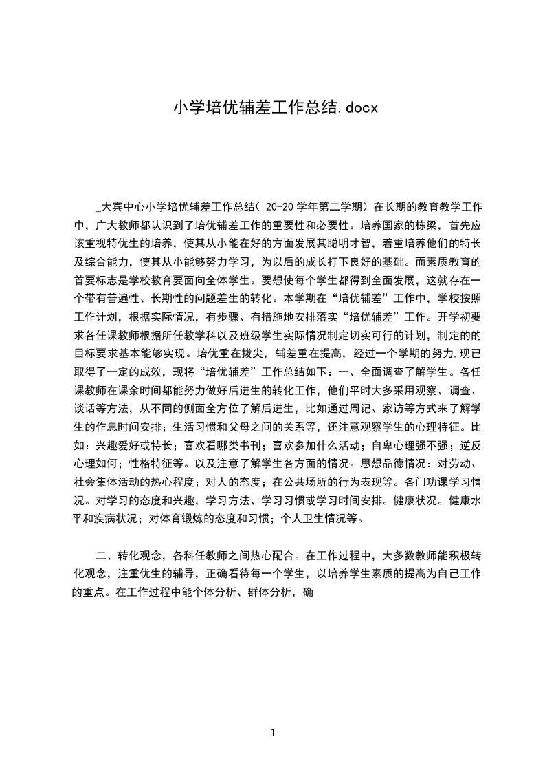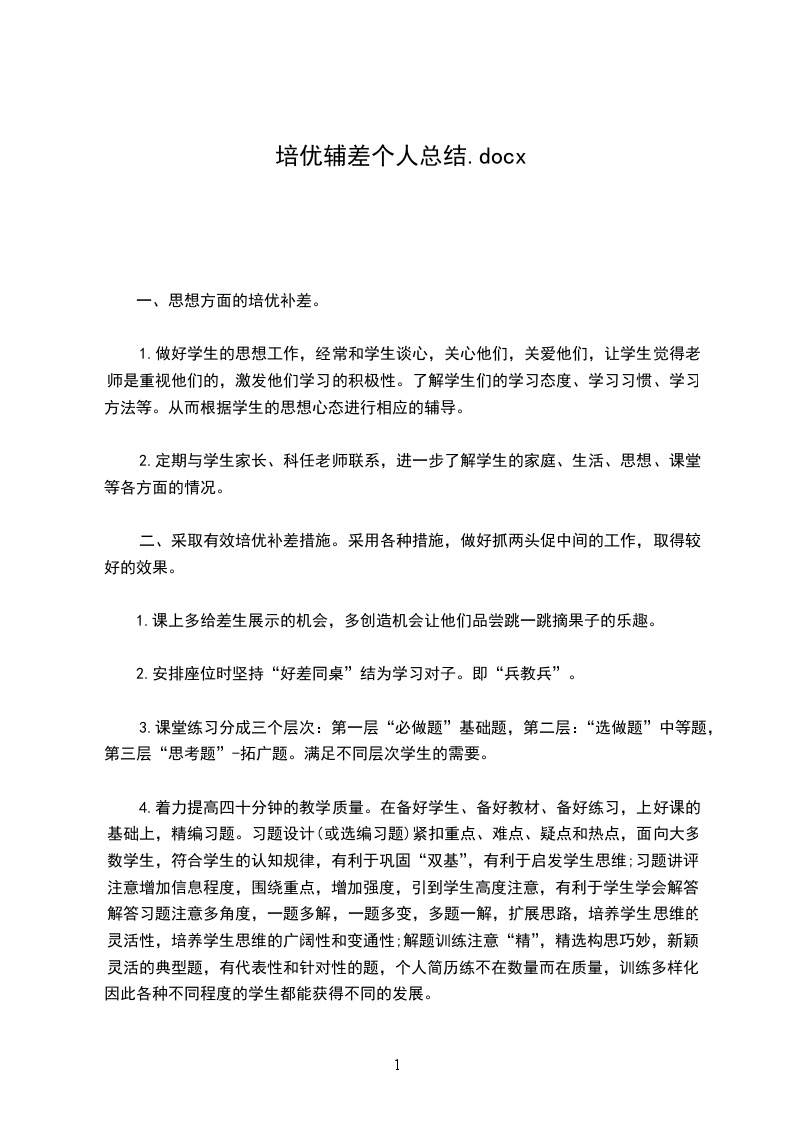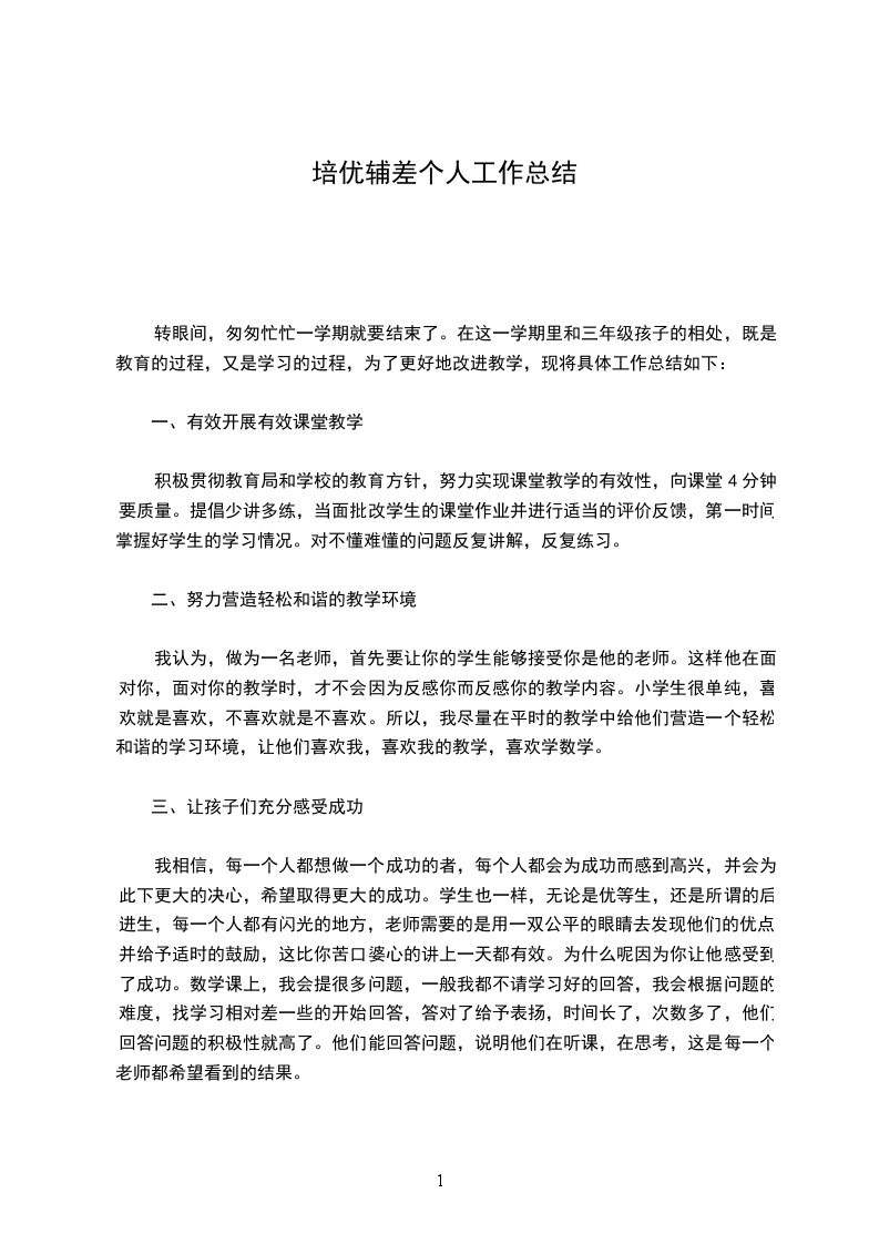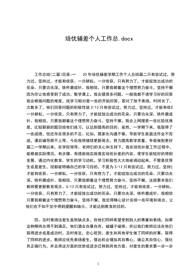 工作总结(二篇)目录:一20年培优辅差学期工作个人总结篇二只有尝试过,努力过,坚持过,才能有收获。一分耕耘,一分收获,只有努力了,才能绽放出成功的花朵。只要功夫深,铁杵磨成针。我相信,只要我朝着这个理想努力奋斗,坚持不懈,因为你让他感受到了成功。数学课上,我会提很多问题,一般我都不请学习好的回答,我会根据问题的难度,找学习相对差一些的开始回答,答对了给予表扬,时间长了,次数多了,他们回答问题的积极性就2/13只有尝试过,努力过,坚持过,才能有收获。一分耕耘,一分收获,只有努力了,才能绽放出成功的花朵。只要功夫深,铁杵磨成针。我相信,只要我朝着这个理想努力奋斗,坚持不懈,我会上网搜索一些比较优难度,比较新颖的题目给他们练习,以达到提高的目的。虽然,一学期下来,我取得了一些成绩,但还存在很多的不足。比如,跟家长沟通不够,导致学生家庭法作业不完成,课后辅导跟不上等。今后我将继续更新观念,努力提高教学质量,争取做到更好。篇二一学期以来,在学校领导、老师们的关心和支持下,我在培优补差工作过程中,能根据实际情况,有步骤、有措施地实施落实培优补差的内容,使学生能较好的得到发展。通过内化教育,学生的学习动机,学习积极性大大地被调动起来,不管是优等生或是差生,现都能明确自己的学习目的,不是为3/13只有尝试过,努力过,坚持过,才能有收获。一分耕耘,一分收获,只有努力了,才能绽放出成功的花朵。只要功夫深,铁杵磨成针。我相信,只要我朝着这个理想努力奋斗,坚持不懈,这就要求我们教师要更新教育观念。5/13只有尝试过,努力过,坚持过,才能有收获。一分耕耘,一分收获,只有努力了,才能绽放出成功的花朵。只要功夫深,铁杵磨成针。我相信,只要我朝着这个理想努力奋斗,坚持不懈,我觉得精心设计安排一些环境和场合,让他们在不知不觉中得到提醒和暗示,才能达到教育的目的。