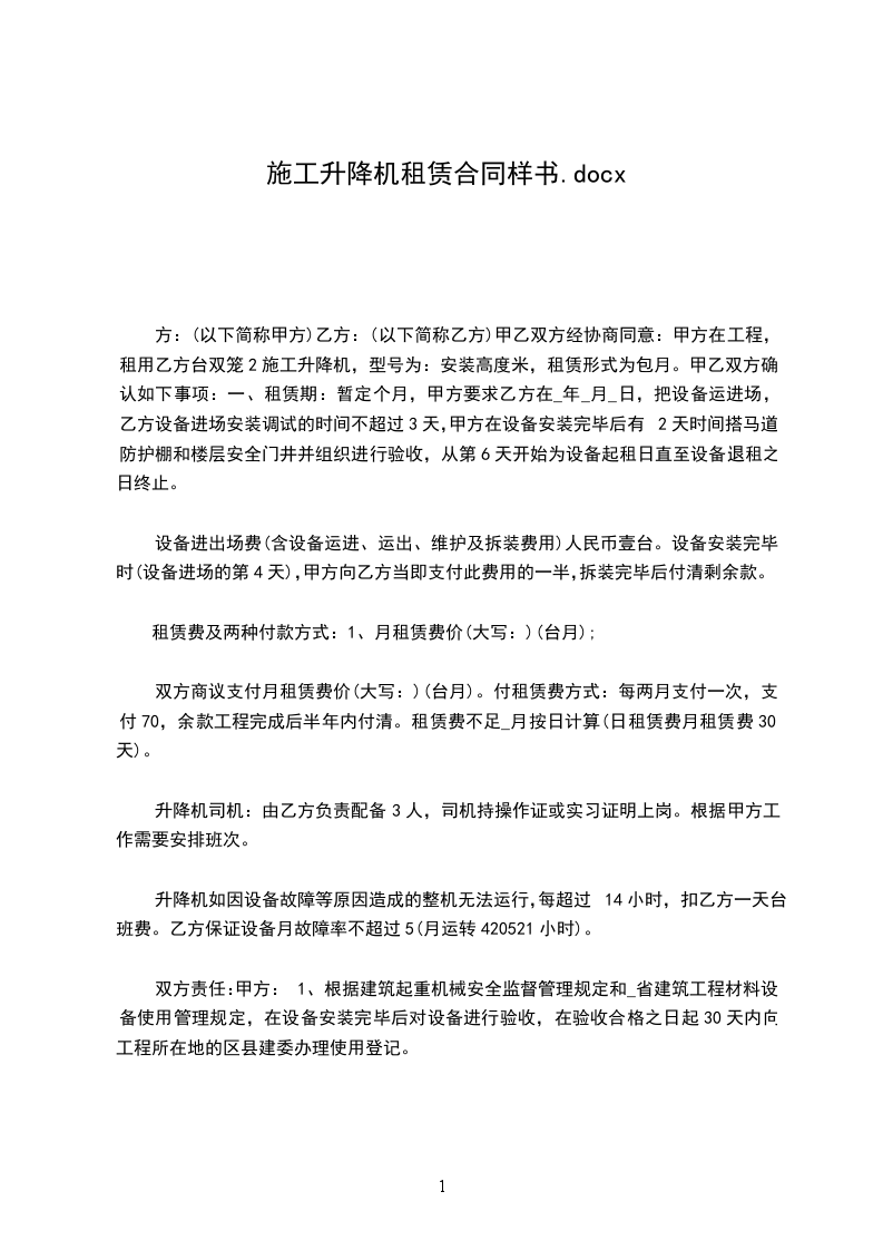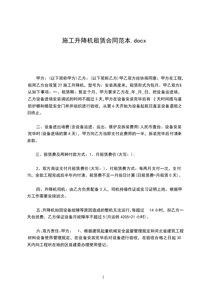 方:(以下简称甲方)乙方:(以下简称乙方)甲乙双方经协商同意:甲方在工程,租用乙方台双笼2施工升降机,型号为:安装高度米,租赁形式为包月。甲乙双方确认如下事项:一、租赁期:暂定个月,甲方要求乙方在_年_月_日,把设备运进场,乙方设备进场安装调试的时间不超过3天,甲方在设备安装完毕后有2天时间搭马道、防护棚和楼层安全门井并组织进行验收,从第6天开始为设备起租日直至设备退租之日终止。