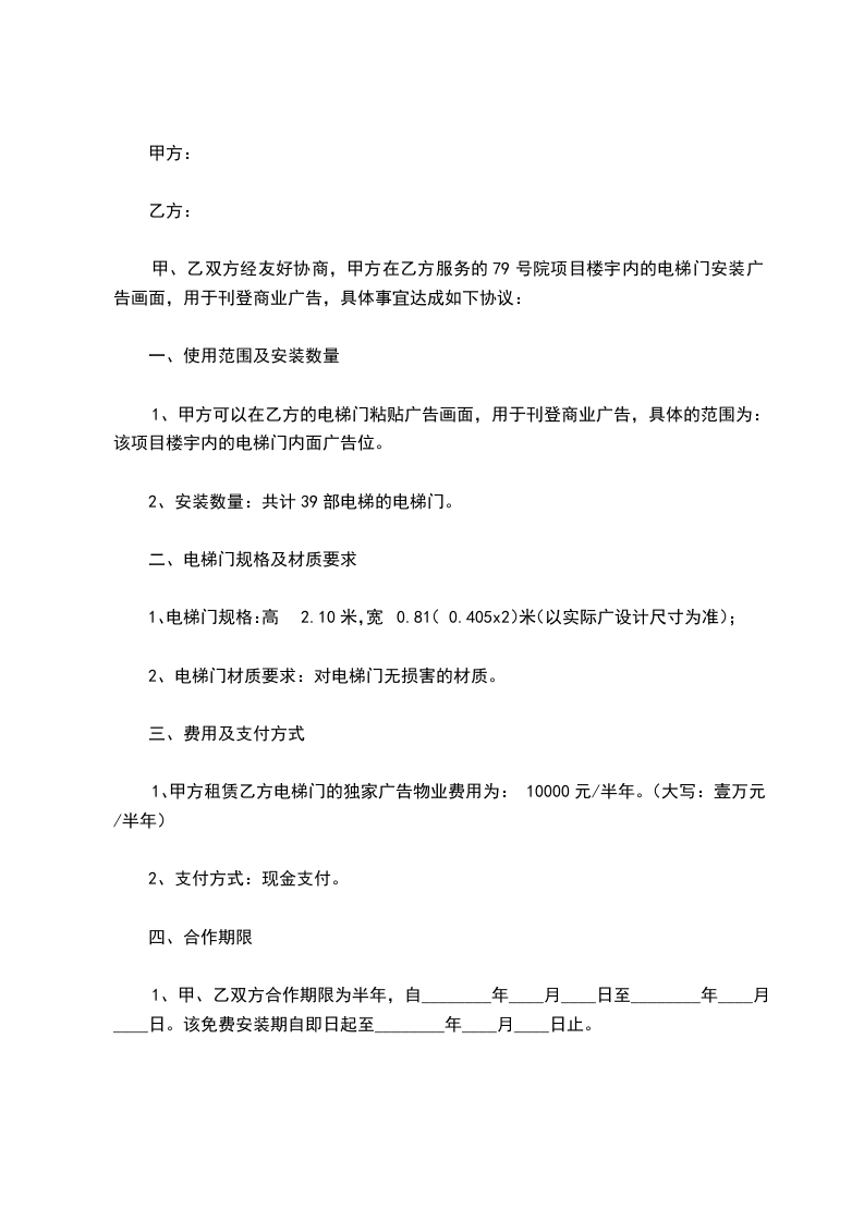 甲、乙双方经友好协商,甲方在乙方服务的79号院项目楼宇内的电梯门安装广告画面,用于刊登商业广告,具体事宜达成如下协议: