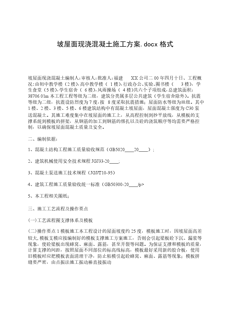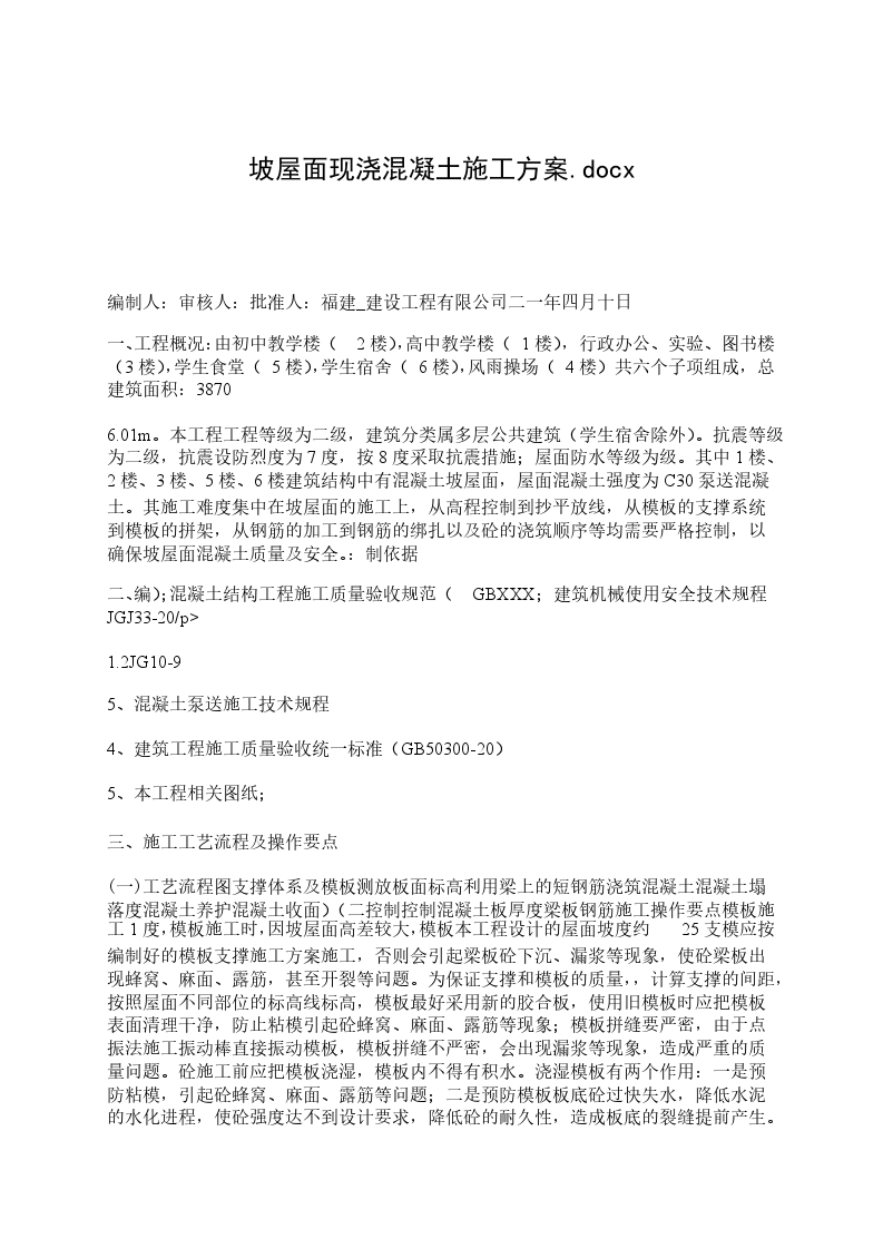 6、坡屋面砼浇筑最好安排在白天施工,确需在夜间浇筑混凝土时,应有足够的照明,并防止眩光。福建XX公司日10月2年20