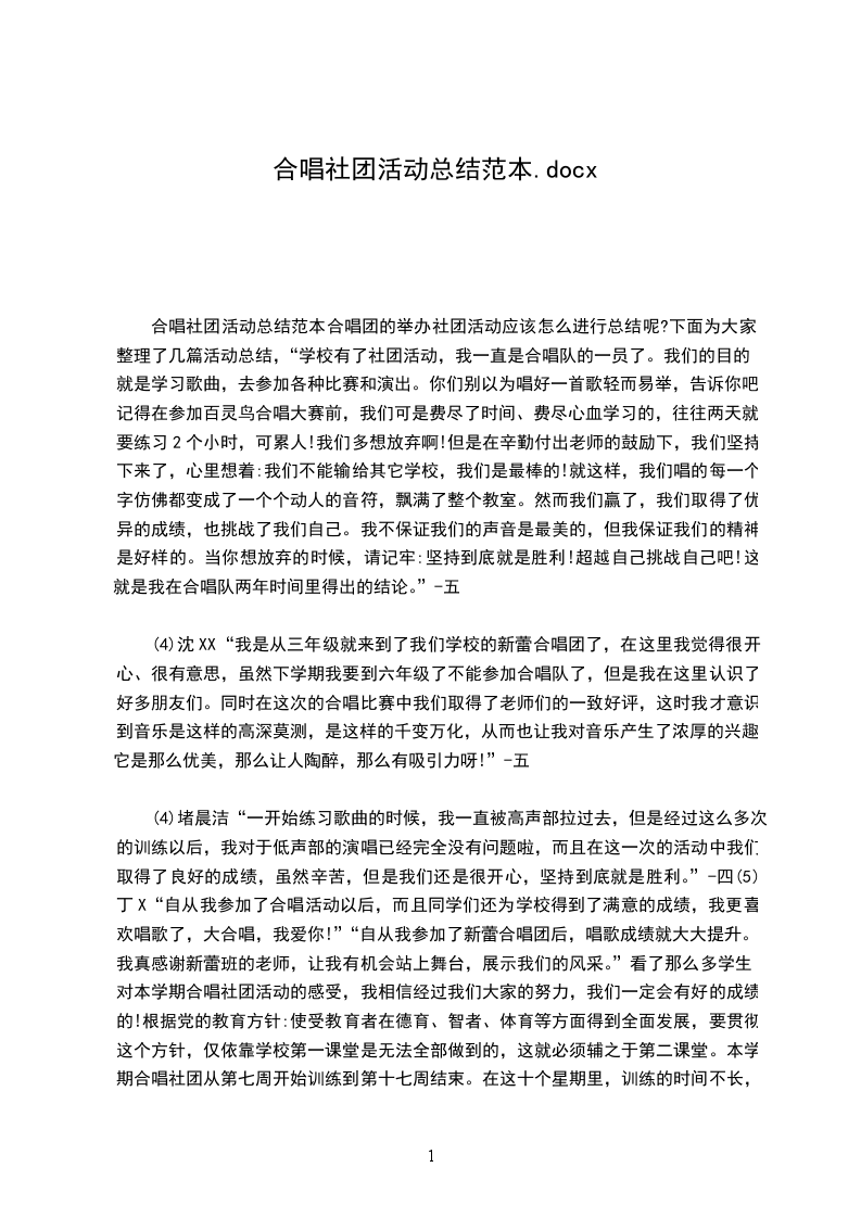 合唱社团活动总结范本合唱团的举办社团活动应该怎么进行总结呢?下面为大家整理了几篇活动总结,“学校有了社团活动,我一直是合唱队的一员了。我们的目的就是学习歌曲,去参加各种比赛和演出。你们别以为唱好一首歌轻而易举,告诉你吧,记得在参加百灵鸟合唱大赛前,我们可是费尽了时间、费尽心血学习的,往往两天就要练习2个小时,可累人!我们多想放弃啊!但是在辛勤付出老师的鼓励下,我们坚持下来了,心里想着:我们不能输给其它学校,我们是最棒的!就这样,我们唱的每一个字仿佛都变成了一个个动人的音符,飘满了整个教室。然而我们赢了,我们取得了优异的成绩,也挑战了我们自己。我不保证我们的声音是最美的,但我保证我们的精神是好样的。当你想放弃的时候,请记牢:坚持到底就是胜利!超越自己挑战自己吧!这就是我在合唱队两年时间里得出的结论。”-五