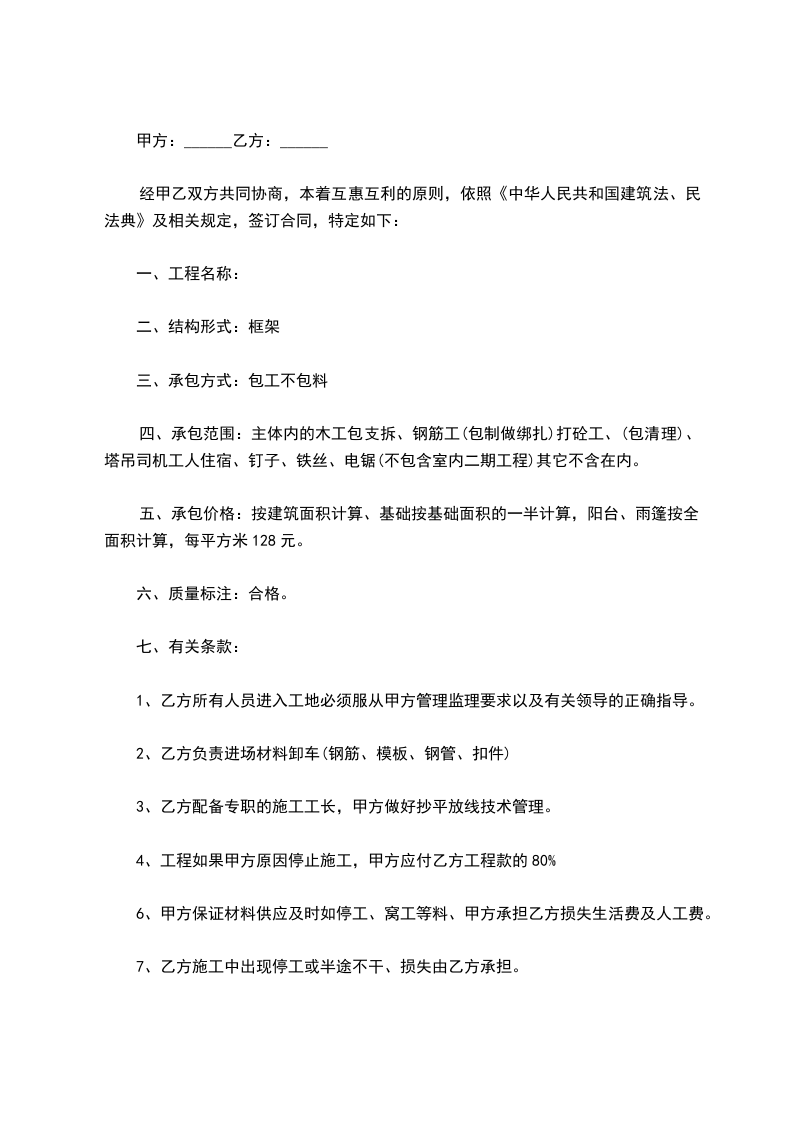 一、承包方式:包工不包料