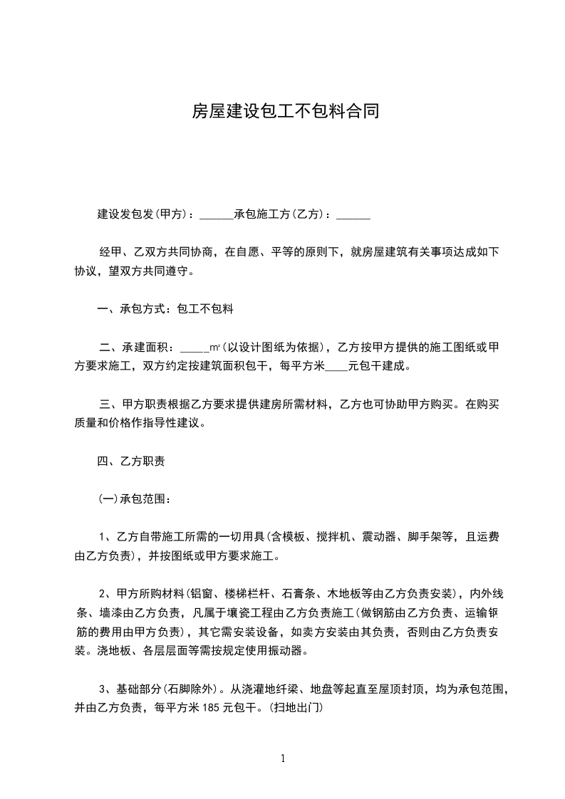 3、基础部分(石脚除外)。从浇灌地纤梁、地盘等起直至屋顶封顶,均为承包范围,并由乙方负责,每平方米185元包干。(扫地出门)