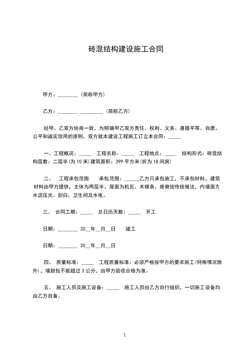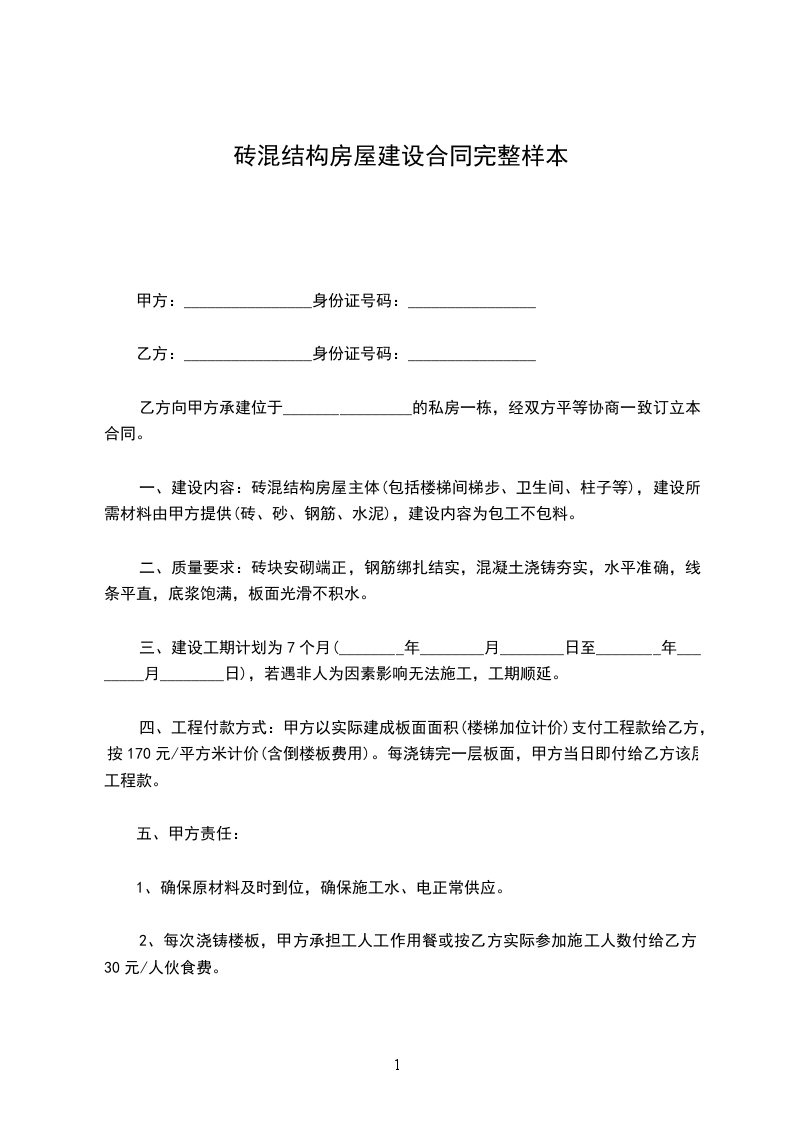 一、建设内容:砖混结构房屋主体(包括楼梯间梯步、卫生间、柱子等),建设所需材料由甲方提供(砖、砂、钢筋、水泥),建设内容为包工不包料。