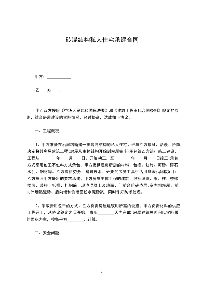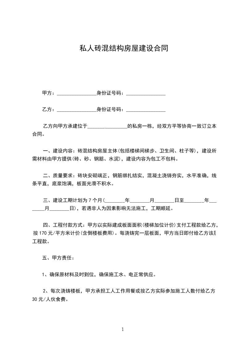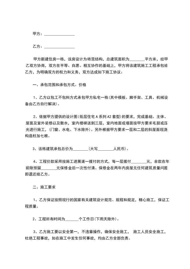 乙方向甲方承建位于________________的私房一栋,经双方平等协商一致订立本合同。