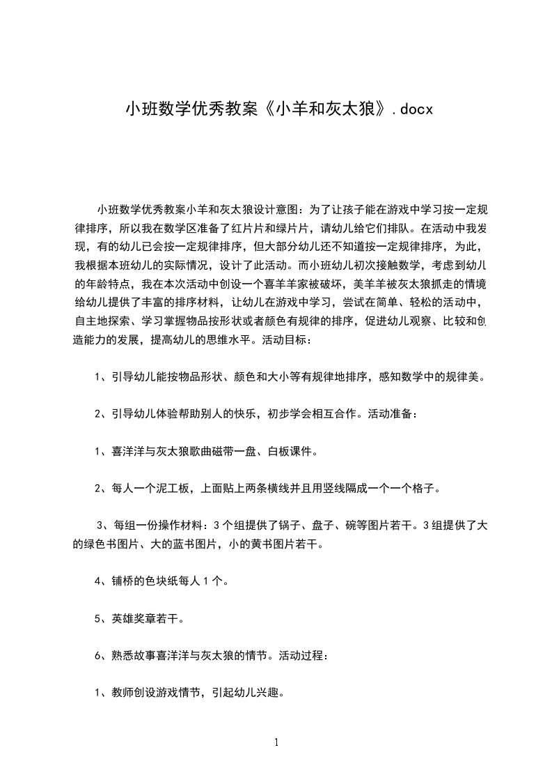 小班数学优秀教案小羊和灰太狼设计意图:为了让孩子能在游戏中学习按一定规律排序,所以我在数学区准备了红片片和绿片片,请幼儿给它们排队。在活动中我发现,有的幼儿已会按一定规律排序,但大部分幼儿还不知道按一定规律排序,为此,我根据本班幼儿的实际情况,设计了此活动。而小班幼儿初次接触数学,考虑到幼儿的年龄特点,我在本次活动中创设一个喜羊羊家被破坏,美羊羊被灰太狼抓走的情境,给幼儿提供了丰富的排序材料,让幼儿在游戏中学习,尝试在简单、轻松的活动中,自主地探索、学习掌握物品按形状或者颜色有规律的排序,促进幼儿观察、比较和创造能力的发展,提高幼儿的思维水平。活动目标: