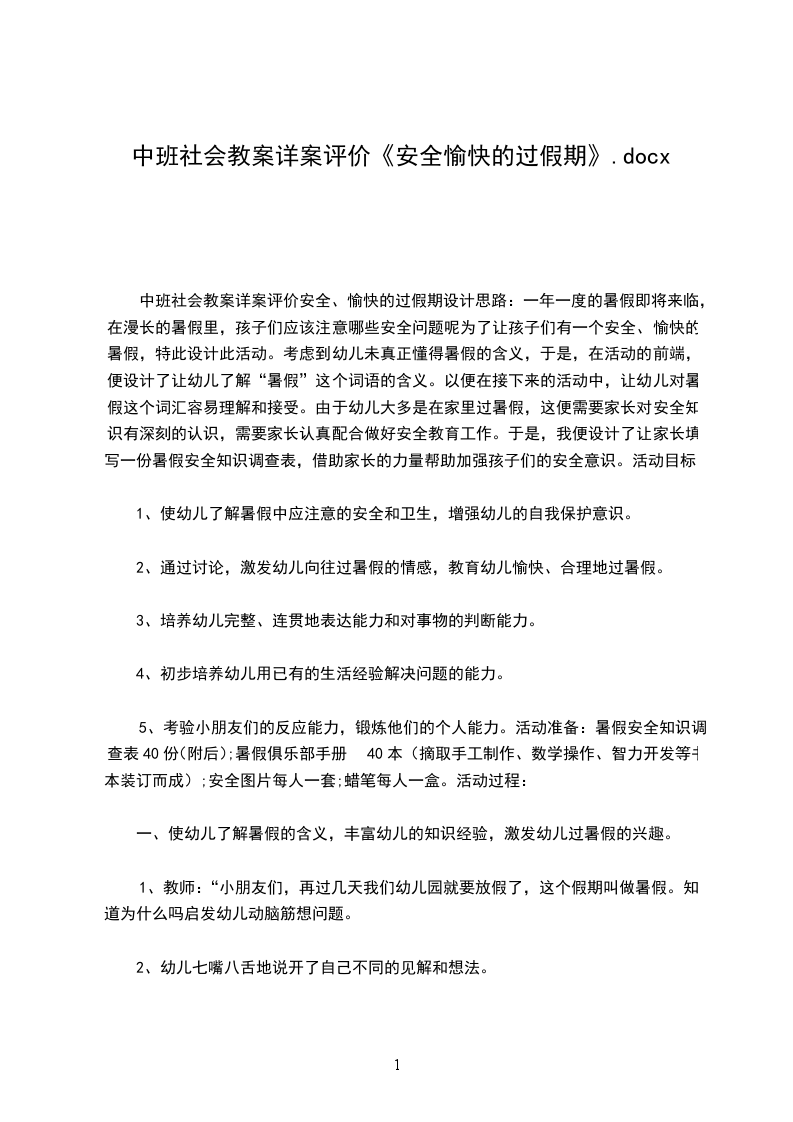 中班社会教案详案评价安全、愉快的过假期设计思路:一年一度的暑假即将来临,在漫长的暑假里,孩子们应该注意哪些安全问题呢为了让孩子们有一个安全、愉快的暑假,特此设计此活动。考虑到幼儿未真正懂得暑假的含义,于是,在活动的前端,便设计了让幼儿了解“暑假”这个词语的含义。以便在接下来的活动中,让幼儿对暑假这个词汇容易理解和接受。由于幼儿大多是在家里过暑假,这便需要家长对安全知识有深刻的认识,需要家长认真配合做好安全教育工作。于是,我便设计了让家长填写一份暑假安全知识调查表,借助家长的力量帮助加强孩子们的安全意识。活动目标: