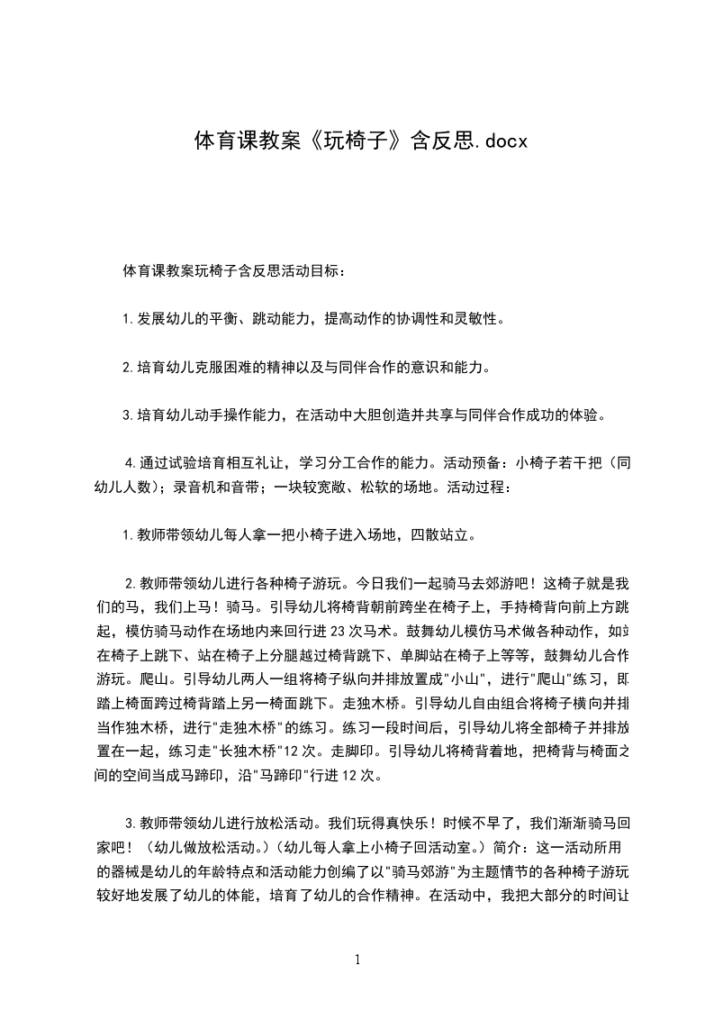 3.教师带领幼儿进行放松活动。我们玩得真快乐!时候不早了,我们渐渐骑马回家吧!(幼儿做放松活动。)(幼儿每人拿上小椅子回活动室。)简介:这一活动所用的器械是幼儿的年龄特点和活动能力创编了以"骑马郊游"为主题情节的各种椅子游玩,较好地发展了幼儿的体能,培育了幼儿的合作精神。在活动中,我把大部分的时间让给幼儿活动。如:给每个幼儿一张椅子,以削减等待,削减不必要的整队,从而使活动具有一定的运动密度和强度。当幼儿利用小椅子进行走、跨、跳等练习时,我将全面观看和重点观看相结合,分类指导,准时调整活动计划,以满意幼儿的需要,从而转变了以往只重教材、忽视幼儿或只重结果、忽视过程的教学方法。为幼儿创设了一个宽松、自由的心理环境。无论是幼儿的个体活动、结伴活动,还是集体活动,我始终以培育幼儿的创造才能为重。活动反思:幼儿参与体育活动的内驱力来自于他们的好奇、好动的心理以及对体育运动的热忱和渴望,在活动中教师应采用生动活泼、富有情趣的活动方式,充分调动幼儿的积极性。本活动所用的器械师幼儿日常使用的小椅子,依据幼儿的年龄特点和活动能力创编了各种椅子游玩,较好的发展了幼儿钻、平衡、跳动等技能,重点培育了幼儿的合作精神。活动中我把大部分时间留给幼儿进行自由探索活动。小学生留意力不易集中,完成动作的能力存在差异,教学中不能采用机械呆板、枯燥单一的模式。幼儿活泼好动的特点,打算了我们在体育教学中对幼儿要求不易太严,规定不易过死,允许他们在课堂上发挥他们的聪慧才智。这才是真正的欢乐体育,只能这样才能真正展示幼儿的个性,极大的提高幼儿参与体育运动的热忱。留意力不易集中,完成动作的能力存在差异,教学中不能采用机械、呆板、枯燥单一的模式。幼儿活泼好动的特点,打算了我们在体育教学中对幼儿要求不易太严,规定不易过死,允许他们在课堂上发挥他们的聪慧才智。这才是真正的欢乐体育,只能这样才能真正展示学生的个性,极大的提高幼儿参与体育运动的热忱。不足之处: