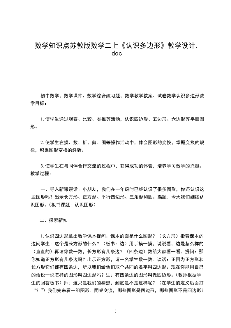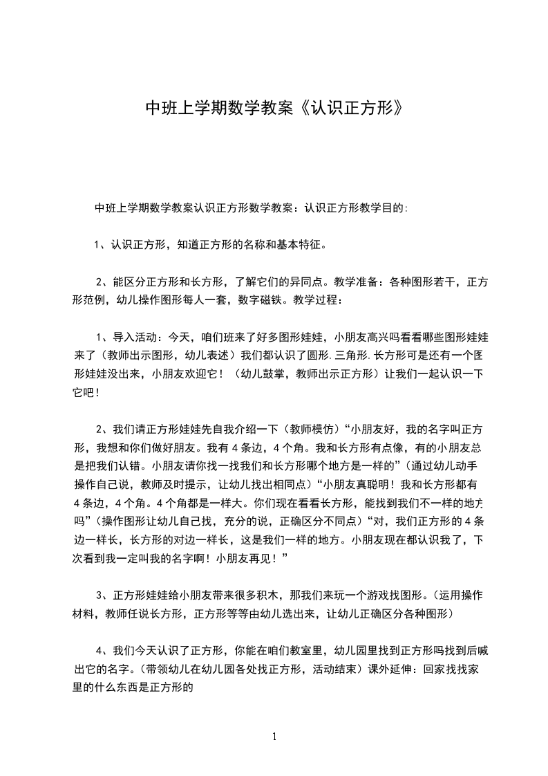 中班上学期数学教案认识正方形数学教案:认识正方形教学目的: