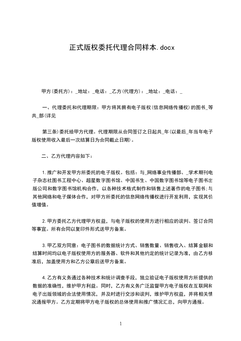 第三条)委托给甲方代理。代理期限从合同签订之日起共_年(以最后_年当年电子版权使用收入最后一次结算日为合同截止日期)。