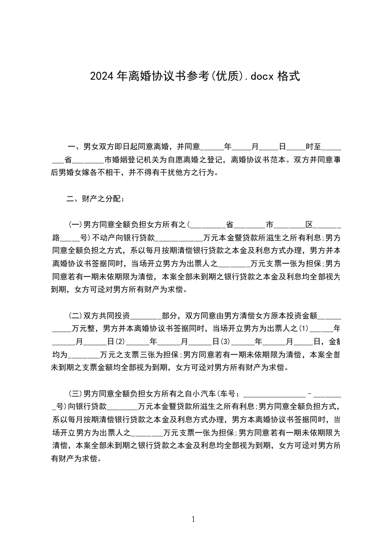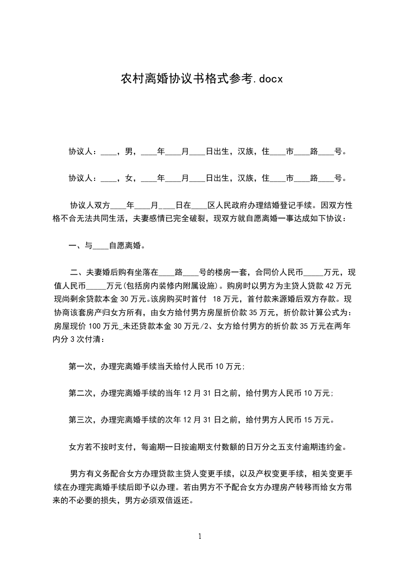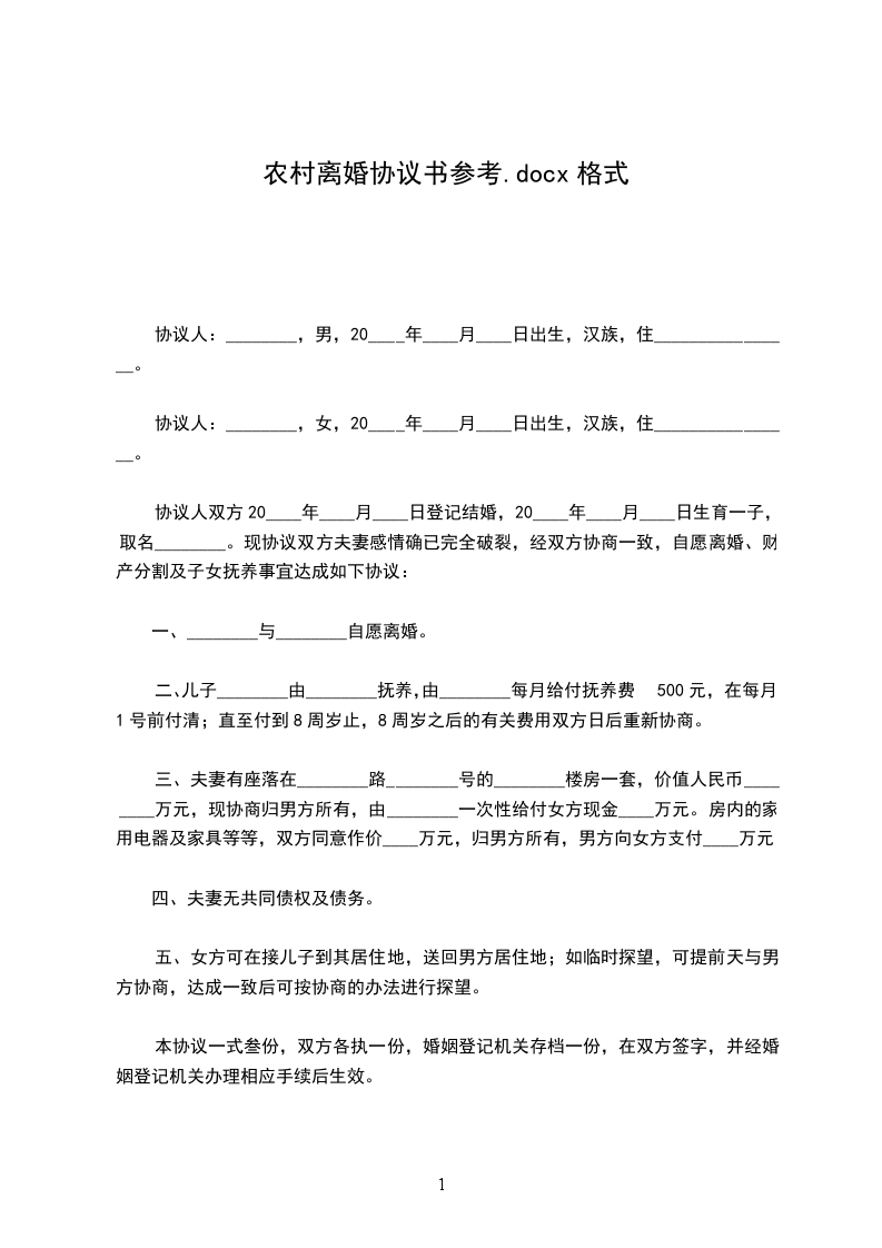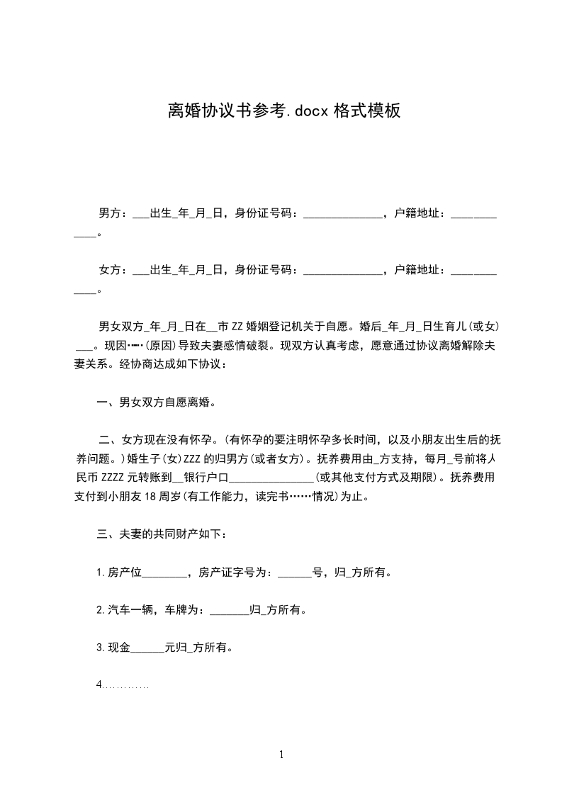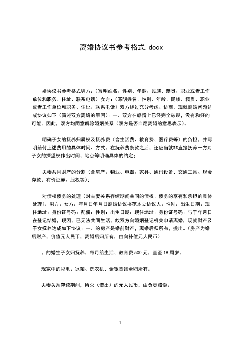 婚协议书参考格式男方:(写明姓名、性别、年龄、民族、籍贯、职业或者工作单位和职务、住址、联系电话)女方:(写明姓名、性别、年龄、民族、籍贯、职业或者工作单位和职务、住址、联系电话)双方经过充分考虑、协商,现就离婚问题达成协议如下(简述双方离婚的原因):一、双方在感情上已经完全破裂,没有和好的可能。因此,双方均同意解除婚姻关系(双方是否自愿离婚的意思表示)。