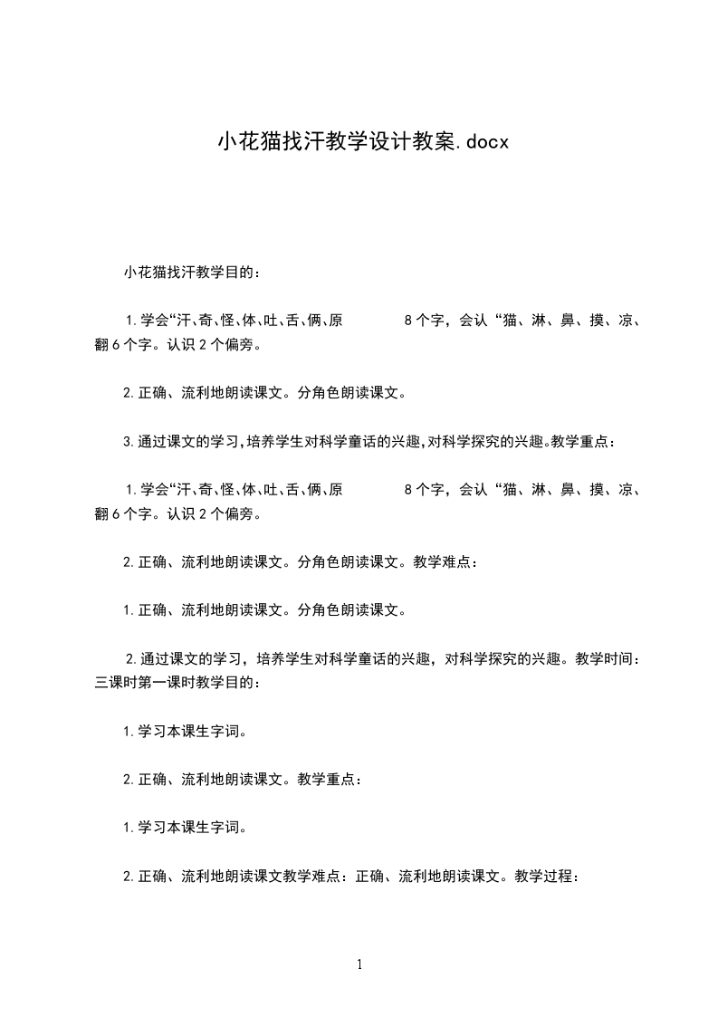1.学会“汗、奇、怪、体、吐、舌、俩、原8个字,会认“猫、淋、鼻、摸、凉、翻6个字。认识2个偏旁。