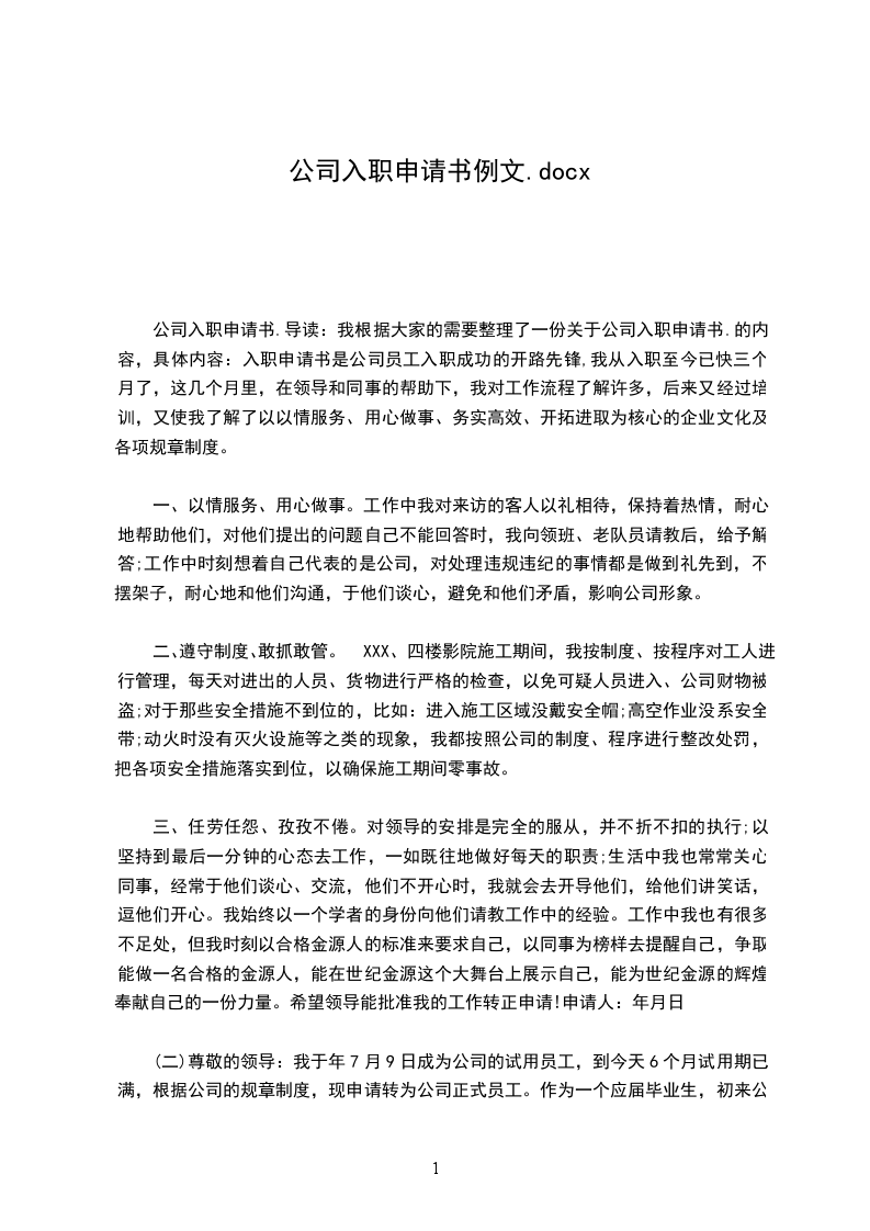 公司入职申请书.导读:我根据大家的需要整理了一份关于公司入职申请书.的内容,具体内容:入职申请书是公司员工入职成功的开路先锋,我从入职至今已快三个月了,这几个月里,在领导和同事的帮助下,我对工作流程了解许多,后来又经过培训,又使我了解了以以情服务、用心做事、务实高效、开拓进取为核心的企业文化及各项规章制度。