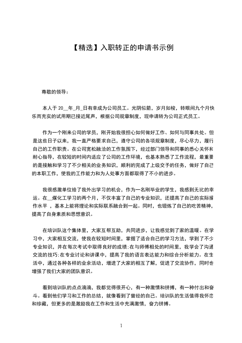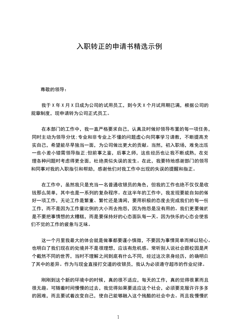 (二)尊敬的领导:我于年7月9日成为公司的试用员工,到今天6个月试用期已满,根据公司的规章制度,现申请转为公司正式员工。作为一个应届毕业生,初来公司,曾经很担心不知该怎么与人共处,该如何做好工作;但是公司宽松融洽的工作氛围、团结向上的企业文化,让我很快完成了从学生到职员的转变。在轮岗实习期间,我先后在工程部、成本部、企发部和办公室等各个部门的学习工作了一段时间。这些部门的业务是我以前从未接触过的,和我的专业知识相差也较大;但是各部门领导和同事的耐心指导,使我在较短的时间内适应了公司的工作环境,也熟悉了公司的整个操作流程。在本部门的工作中,我一直严格要求自己,认真及时做好领导布置的每一项任务,同时主动为领导分忧;专业和非专业上不懂的问题虚心向同事学习请教,不断提高充实自己,希望能尽早独当一面,为公司做出更大的贡献。当然,初入,难免出现一些小差小错需领导指正;但前事之鉴,后事之师,这些经历也让我不断成熟,在处理各种问题时考虑得更全面,杜绝类似失误的发生。在此,我要特地感谢部门的领导和同事对我的入职指引和帮助,感谢他们对我工作中出现的失误的提醒和指正。经过这六个月,我现在已经能够独立处理公司的帐务,整理部门内部各种资料,进行各项税务申报,协助进行资金分析,从整体上把握公司的财务运作流程。当然我还有很多不足,处理问题的经验方面有待提高,团队协作能力也需要进一步增强,需要不断继续学习以提高自己业务能力。这是我的第一份工作,这半年来我学到了很多,感悟了很多;看到公司的迅速发展,我深深地感到骄傲和自豪,也更加迫切的希望以一名正式员工的身份在这里工作,实现自己的奋斗目标,体现自己的人生价值,和公司一起成长。在此我提出转正申请,恳请领导给我继续锻炼自己、实现理想的机会。我会用谦虚的态度和饱满的热情做好我的本职工作,为公司创造价值,同公司一起展望美好的未来!申请人:年月日