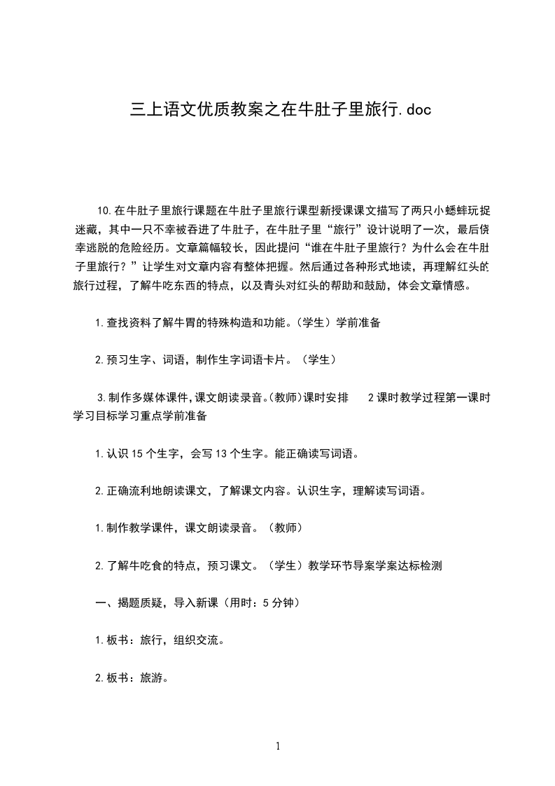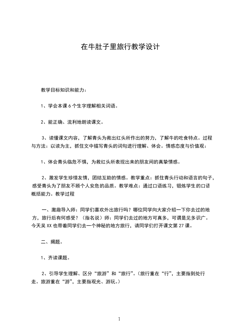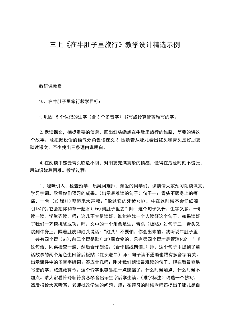 3.提问:读了课文,你有什么疑问预设:怎么会到牛肚子里旅行呢在牛肚子里旅行和我们平常的旅行有什么不一样设计意图:围绕“旅行”这个词做文章,让学生分享生活趣事,唤醒学生的生活记忆,同时激发学生探究可稳定的兴趣。
