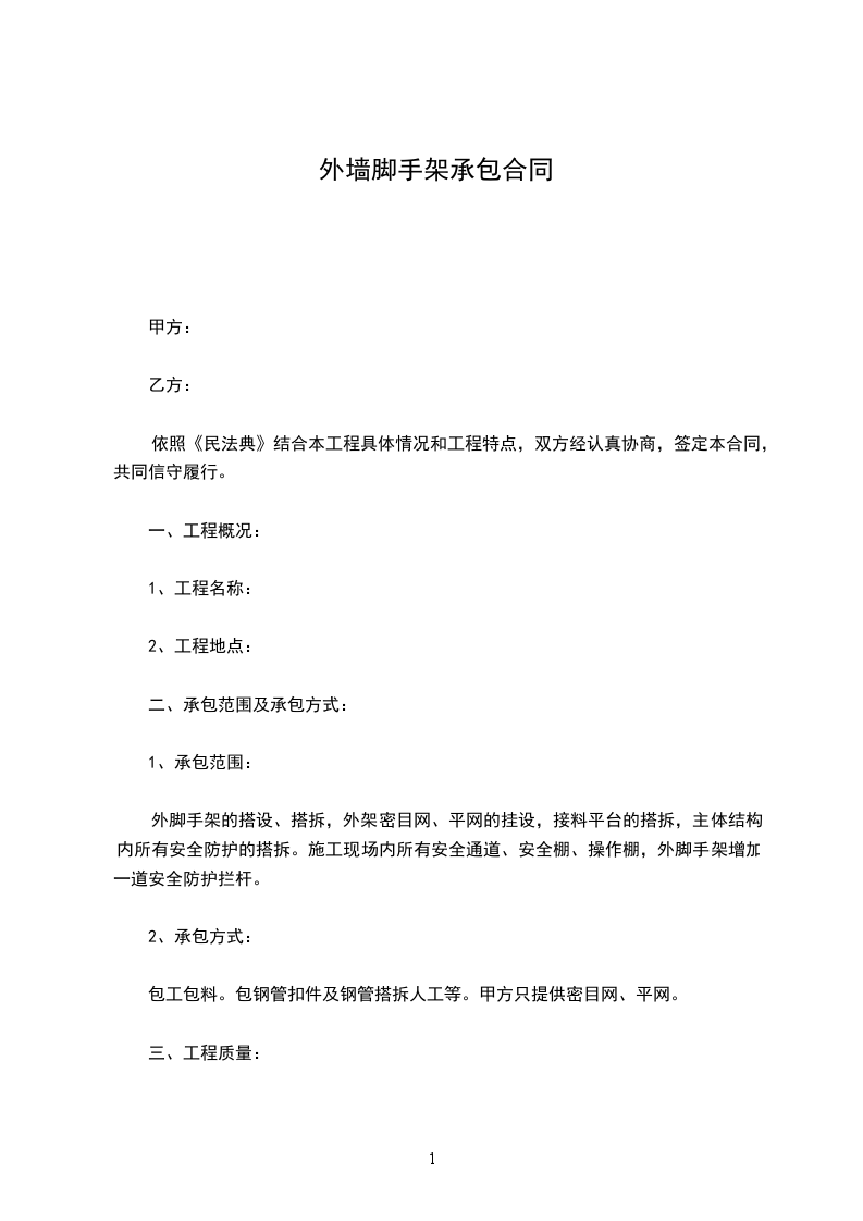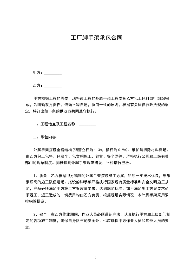 发包方(以下简称甲方):承包方(以下简称乙方):根据建设工程需要,甲方将钢管脚手架搭拆工程承包给乙方施工,按照中华人民共和国建筑法和安全生产法及相关法规的规定,结合本工程具体情况,为明确双方责任,经协商签订本合同。