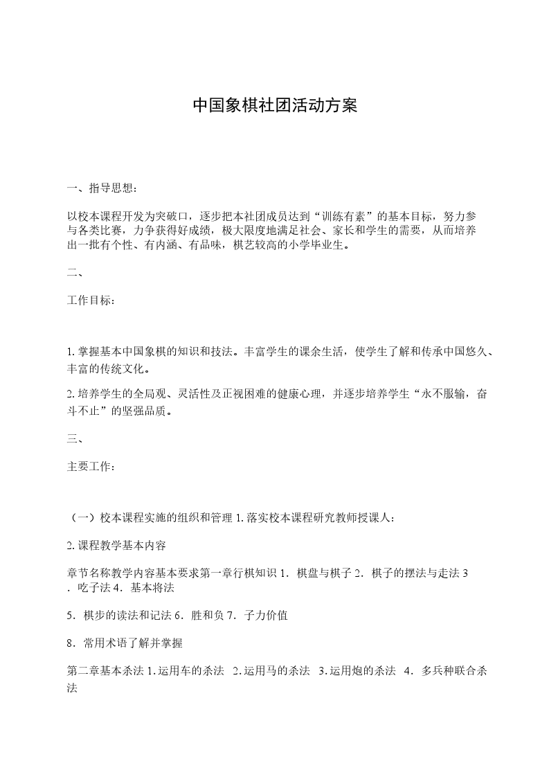 2、象棋经典文化是我国几千年历史留下的丰富的文化遗产,大部分学生对象棋兴趣非常爱好,俗话说“棋道虽小,棋品最尊”。棋,通过方寸天地的拼搏,胜败各半,胜者不骄,败者不馁。所谓“棋如人生”,学生在下棋的过程中,人生观会受到潜移默化的影响:做事要实事求是,不能弄虚作假;凡事要成功,都得付出努力,都要靠自己的真本事;下棋有输有赢,人生亦有沉浮这些道理,学生虽不能立刻明白,但对他们今后的人生道路都将产生极大的影响。、活动目标:总体目标:开发学生智力,全面提高学生文化素质。象棋因为着法多变,趣味性强,对于开发少年儿童的智力,有很好的效果。智力是一种综合能力,其核心是思X力。儿童在下棋的时候,手、眼和左、右脑同时运用,促使儿童思X受到了反复、有效的锻炼,从而增强了思X的灵活性、深刻性、敏捷性,促使智力水平得到提高。学生发展目标:培养学生的意志品质,提高学生的心理品质。象棋的内涵有其独到的教育功能。它能陶冶学生情操,培养孩子谦虚乐观的精神。良好的棋风能培养学生对问题的独立思考能力,正确地估计自己和对手;棋局的胜负可以使学生养成胜不骄、败不馁,顽强拼搏的优良品质。简言之,下棋能改变学生的性格、脾气,铸就积极奋发的向上精神,并对培养学生良好的思想道德、行为习惯,提高学校教育教学质量,有着明显的促进作用。