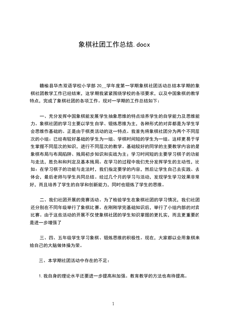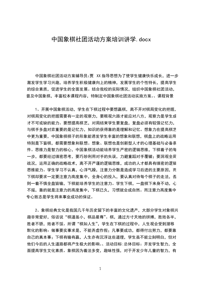 中国象棋社团活动方案辅导员:贾XX指导思想为了使学生健康快乐成长,进一步激发学生学习兴趣,培养学生积极健康向上的精神,发展学生的个性特长,提高学生的综合素质,促进学生的全面发展。结合我校的实际情况,组织中国象棋社团活动,普及中国象棋,丰富校本课程内容,特制定中国象棋社团活动实施方案。、课程背景