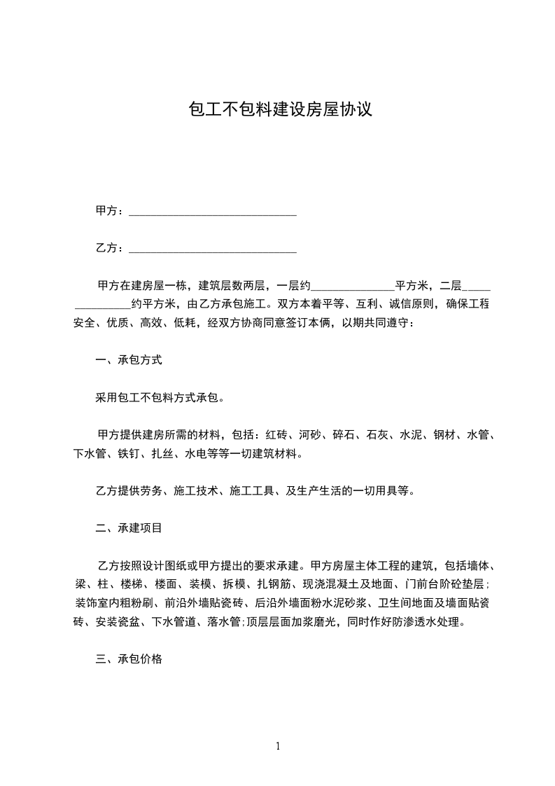 包工不包料形式房屋建设合同