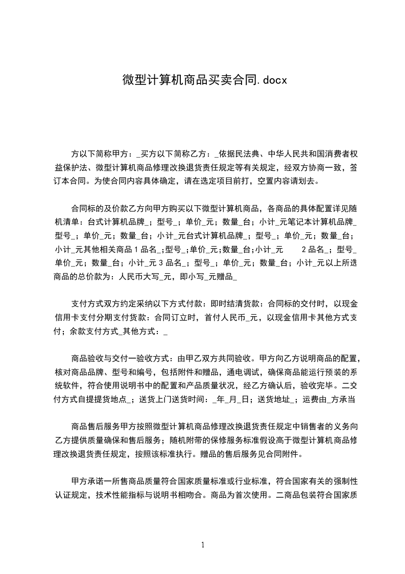 方以下简称甲方:_买方以下简称乙方:_依据民法典、中华人民共和国消费者权益保护法、微型计算机商品修理改换退货责任规定等有关规定,经双方协商一致,签订本合同。为使合同内容具体确定,请在选定项目前打,空置内容请划去。