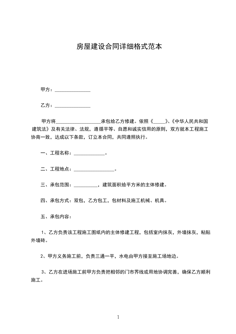 乙方按照设计图纸或甲方提出的要求承建。甲方房屋主体工程的建筑,包括墙体、梁、柱、楼梯、楼面、装模、拆模、扎钢筋、现浇混凝土及地面、门前台阶砼垫层;装饰室内粗粉刷、前沿外墙贴瓷砖、后沿外墙面粉水泥砂浆、卫生间地面及墙面贴瓷砖、安装瓷盆、下水管道、落水管;顶层层面加浆磨光,同时作好防渗透水处理。