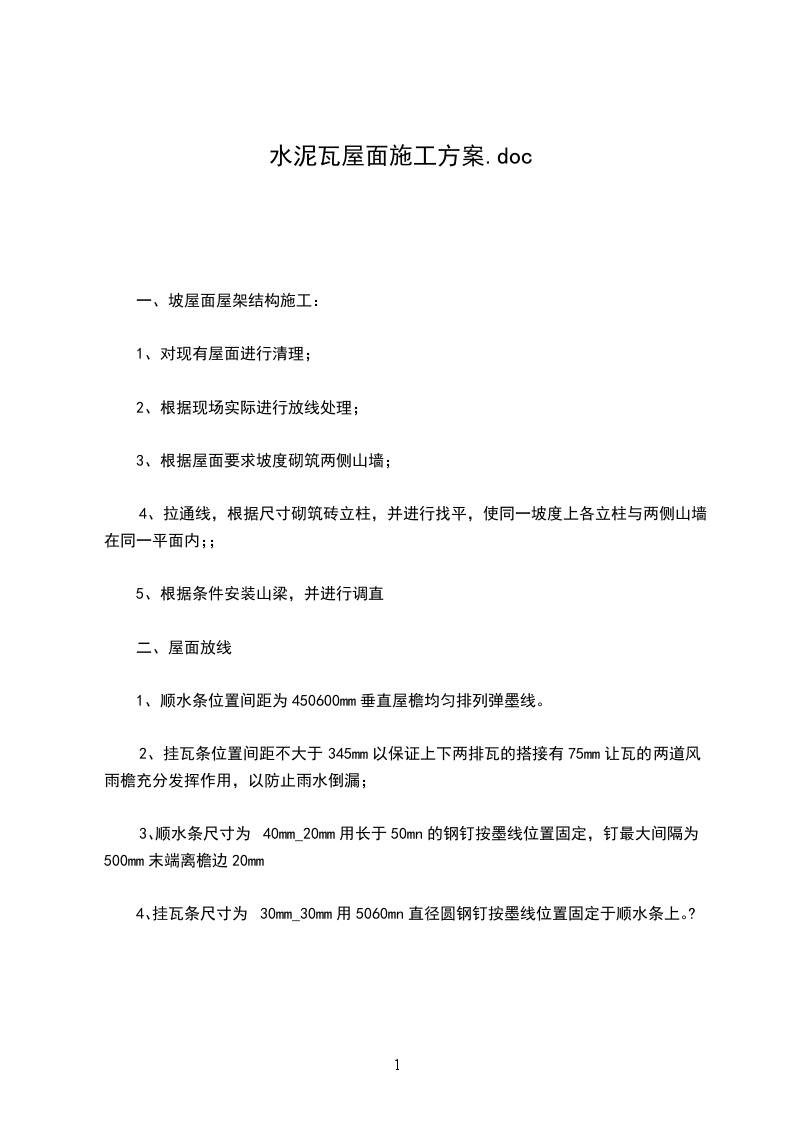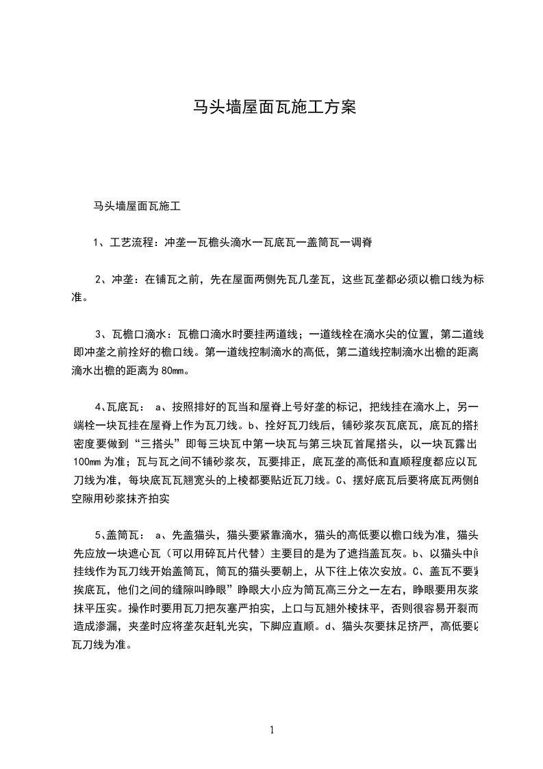 6、铺瓦施工顺序沿屋面长度方向排尺寸平行屋面压顶方向按瓦实际铺设长度-弹挂瓦条限制线一根据限制线钉设挂瓦条一挂瓦条槽内铺砂浆一上瓦铺设一钉固定瓦材一细部处理.施工方法:弹挂瓦条位置限制线找平层施工完,混凝土到达一定强度后,表层清理干净,即可弹出挂瓦条位置限制线.根据瓦的尺寸和坡面的长度经计算后挂瓦条的间距:从檐口向上第一根挂瓦条上边口为305mm向上依次排挂瓦条每根间距337mm钉挂瓦条钉设前先将挂瓦条位置弹出,再按线钉挂瓦条.钉木质挂瓦条在弹出的挂瓦条位置线用水泥钉钉设木质挂瓦条.挂瓦条经过沥青防腐处理.挂瓦条断面为30mm30mm通长方向挂瓦条留出于缺口,以利屋面排水.挂瓦条必须平直,特别是保证挂瓦条上边口的平直、钉牢,上棱成一直线,外表平整.见图1铺瓦前选瓦凡缺边、掉角、裂缝、砂眼、翘曲不平、张口缺爪的瓦,不得使用.通过铺瓦预排,屋脊或瓦沟处如有半瓦,应预先锯好.上瓦待基层检验合格后,方可上瓦,上瓦时应特别注意平安,采取自下而上水平铺设,安装一行后再安装上一行,上瓦时瓦整洁捆成一摞,均匀平稳地摆放在屋面上,位置应相互交错.铺灰、挂瓦挂瓦应从四个坡的檐口同时对称开始.每坡屋面从左侧开始向右侧推进铺设.屋面端头用半瓦错缝.上瓦前先将挂瓦条槽内用水泥砂浆铺满,再将瓦平铺上面,将砂浆挤紧,再钉挂瓦钉.水泥砂浆与挂瓦条结合施工.瓦要与挂瓦条挂牢.瓦爪与瓦槽要搭接紧密,并保证搭接长度.瓦搭接要避开主导风向,以防漏水.檐口要铺成一条直线,瓦头挑出檐口长度50mmr70mm见图2扣脊瓦及沟瓦脊瓦要在大平瓦挂完后拉线铺放.接口需顺主导风向.扣脊瓦要用1:石灰麻刀砂浆铺座平实,其搭接缝用水泥石灰砂浆嵌填,缝口平直,砂浆严密,脊瓦与大平瓦的搭盖宽度每边不少于40.铺好的屋脊斜脊表观平直,无起伏现象.沟瓦上在大平瓦铺设至屋面沟部处时先将沟瓦铺好,然后两边大平瓦铺设在沟瓦上部,沟部两边大平瓦结合重叠局部用切割机顺沟线切割平直.瓦沟处的瓦要根据宽度及斜度弹线锯料,沟边瓦要按设计规定伸入天沟内.靠近屋脊瓦处的第一排瓦应用水泥砂浆窝牢.但切忌灰浆突出瓦外,以防此处渗漏,整坡瓦面就平整,行列横平竖直,无翘角和张口现象.见图