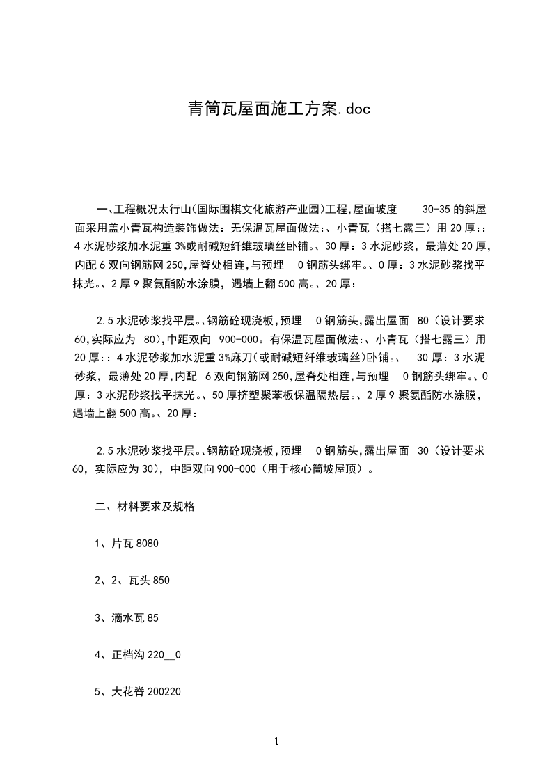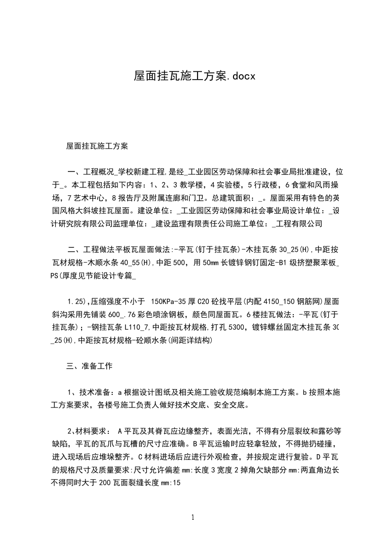 6、成品保护瓦材为易碎材料,在包装、搬运和存放时应注意瓦材的完整性,每块瓦均应用草绳花缠出厂;运输车厢用柔软材料垫稳,搬运轻拿轻放,不得碰撞,抛扔;堆放应整洁,瓦侧放靠紧,堆放高度不超过5层,脊瓦呈人字形堆放.屋面上瓦过程中,应采取相互传递的方式,手工将瓦传递到屋面相应位置,轻拿轻放,预防瓦的破损.挂瓦时,操作人员应预防在瓦上行走,如必须时,脚应踩在瓦的端头,使瓦不被踩断.挂瓦过程中如发现坏瓦,应及时剔除更换.屋面瓦全部铺挂结束清理干净后,应对屋面进行封闭,禁止人员攀爬,行走和进行有损屋面瓦的其他活动.施工前须制定详细周密的成品保护举措,并在施工中严格执行,重点增强对成品保护举措的检查,催促和落实情况.第六节、平安及保证举措建立平安生产文明施工保证体系,制定各级平安责任制,平安员进行巡回检查,班组长检查本班组平安文明施工,全体操作人员自觉遵守有关规定,将平安生产文明施工举措条条落实到人,并同经济利益挂钩.增强平安生产文明施工的教育,操作员上岗前学习平安操作规程及文明施工的治理规定,班组长每日检查一次平安情况并进行平安交底,做到开工前、工序前进行平安教育,牢固树立平安
