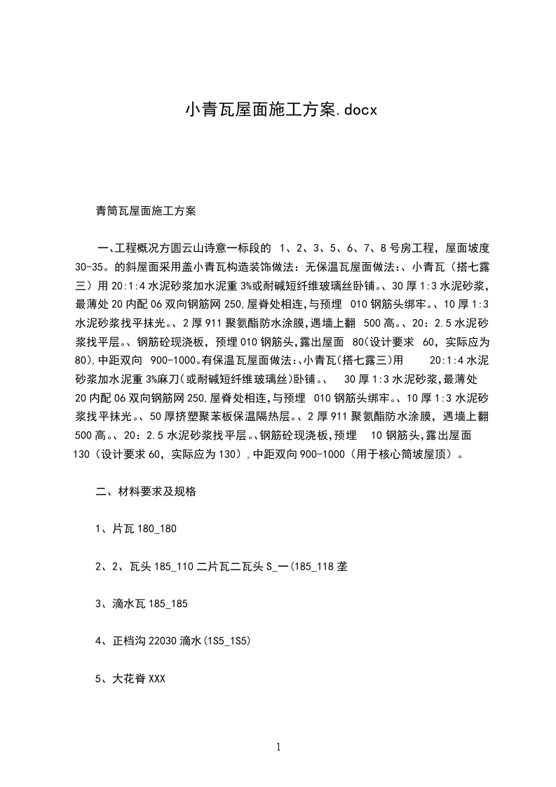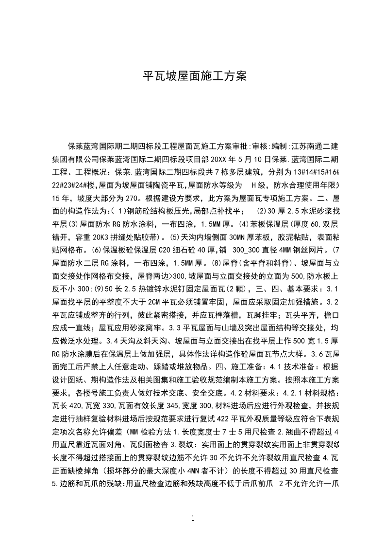 大连XX搬迁改造宗地工程D区一标段大连金鼎源建设工程_三月目录第一节、工程概况3第二节、编制依据3第三节、工艺流程4第四节、质量标准1第五节、平安及保证举措1第一节、工程概况工程概况二十四城D区段位于大连XX北侧,泡崖八区西侧,规划用地约78400卅,总建筑面积156800卅.其中D区一标段小高层5栋,小高层为平屋面,无需屋面瓦施工.7栋洋房,洋房为斜屋面,需屋面瓦施工.本工程屋面坡度较大,此外结构较复杂,细部节点较多,施工难度较大.为了保证屋面造型与设计效果一致,屋面的施工必须严格限制其屋面板、梁等各个细部的标高.施工中特别要注意梁、板节点的平面位置及标高的处理,以及对现浇坡屋面砼浇筑质量的限制.此外,由于屋面板坡度较大,混凝土浇筑质量不易保证,也是本工程坡屋顶的特点.因此施工过程中必须做到施工平安及按图施工,提升工程质量,保证屋面工程的使用功能性良好的原那么,依照国家现行施工质量验收标准的标准,进行斜屋面的施工.第二节、编制依据