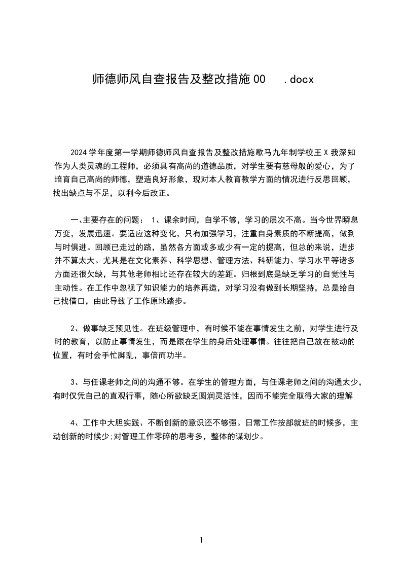 2024学年度第一学期师德师风自查报告及整改措施歇马九年制学校王X我深知作为人类灵魂的工程师,必须具有高尚的道德品质,对学生要有慈母般的爱心,为了培育自己高尚的师德,塑造良好形象,现对本人教育教学方面的情况进行反思回顾,找出缺点与不足,以利今后改正。
