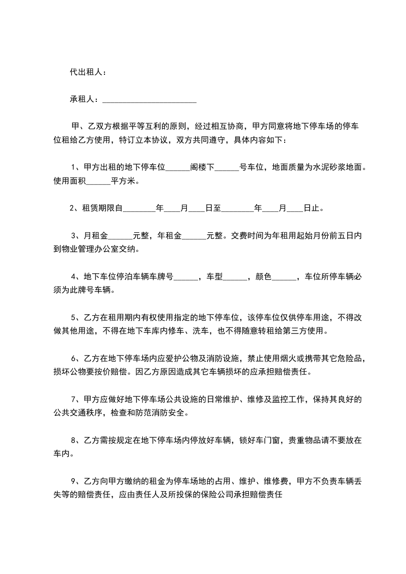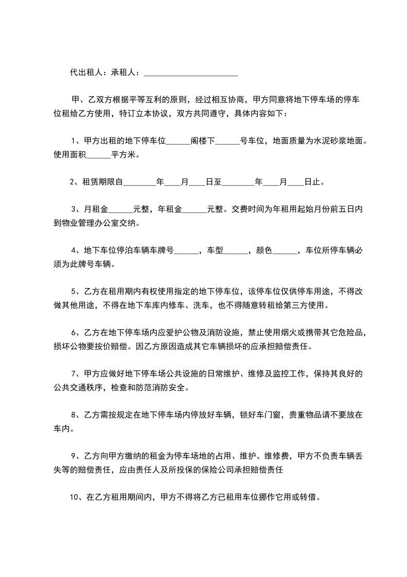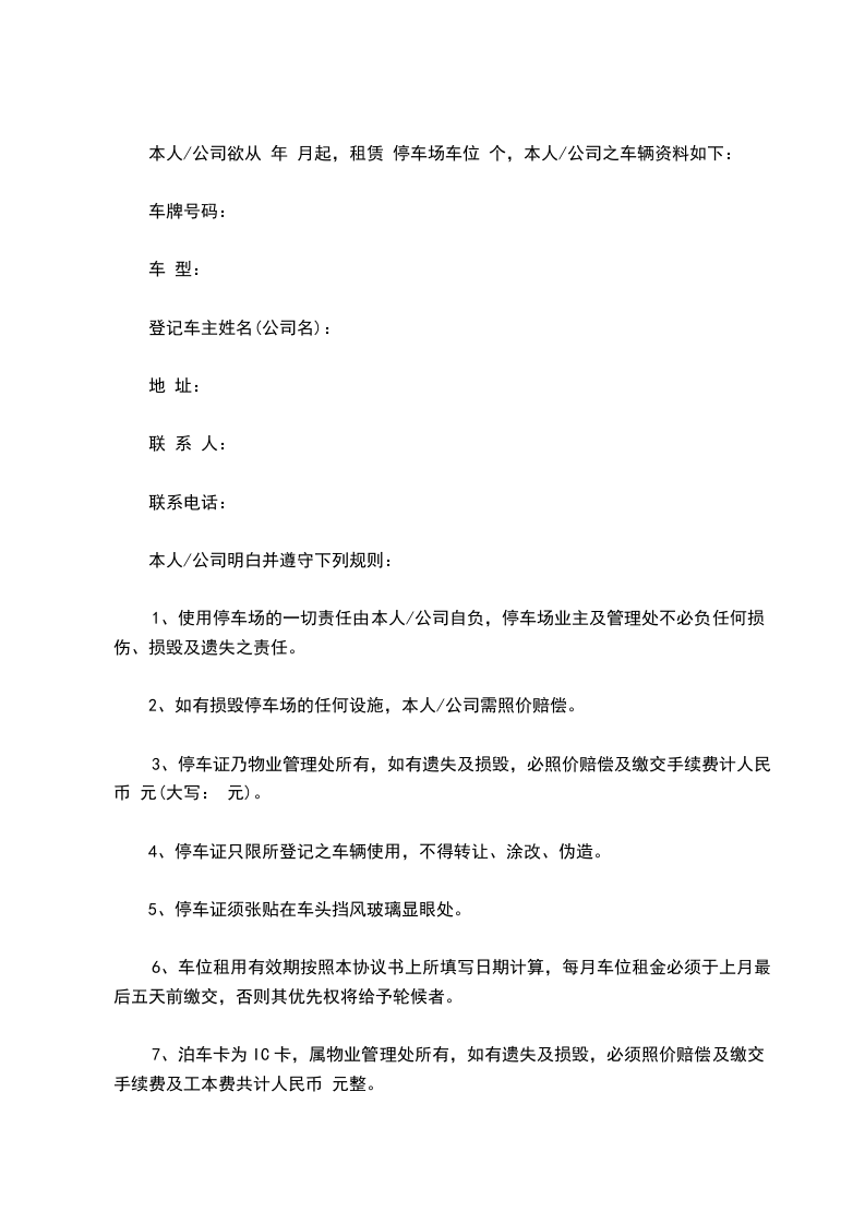 第二条、租赁期限乙方租用本停车位期限为年,自________年____月____日起至________年____月____日止。在乙方向甲方支付全部本停车位租赁费后,甲方同意于________年____月____日前,将本停车位交予乙方使用。