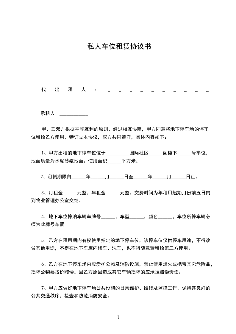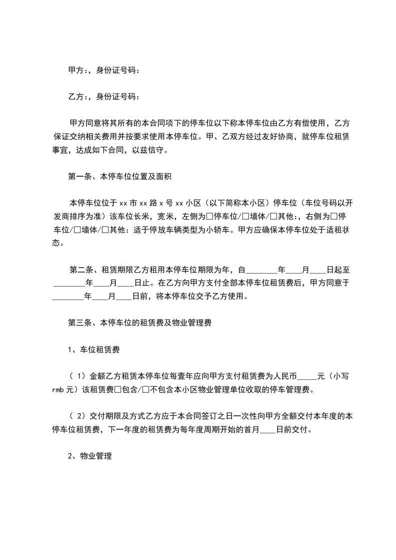 本停车位位于xx市xx路x号xx小区(以下简称本小区)停车位(车位号码以开发商排序为准)该车位长米,宽米,左侧为□停车位/□墙体/□其他:,右侧为□停车位/□墙体/□其他:适于停放车辆类型为小轿车。甲方应确保本停车位处于适租状态。